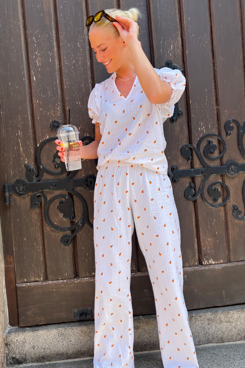 Ejjj, se nu lige den sødeste appelsin bluse fra Neo Noir med matchende bukser. Man kan kun komme i sommerstemning af det her skønne print! Blusen har små søde flæsedetaljer og er lavet i en blød crepet kvalitet med en lille v-udskæring foran og korte pufærmer.
