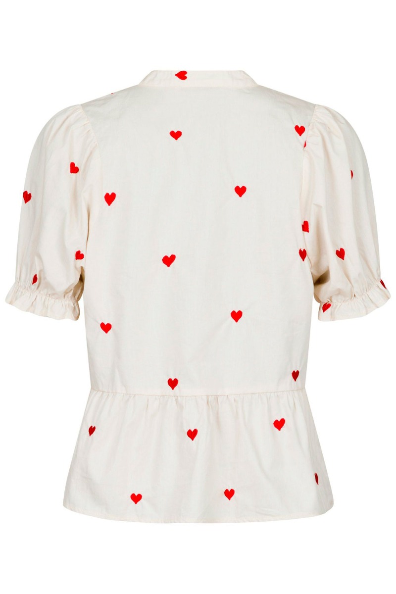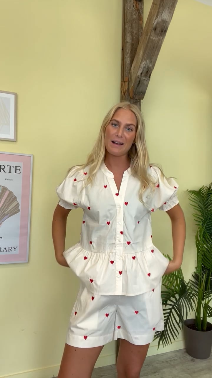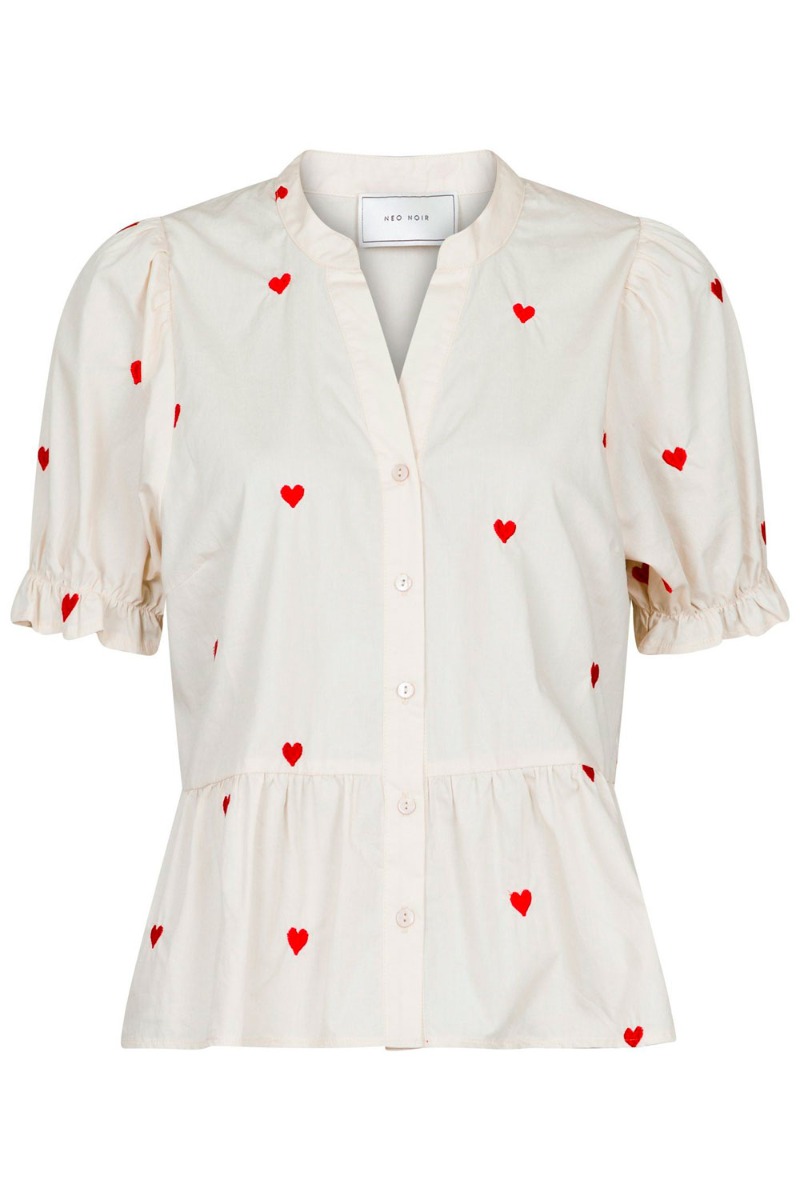 En smuk bluse fra Neo Noir er kommet i en beige farve med små røde hjerter broderet på. Den er løs i pasformen og har knapper foran, derfor er den også ammevenlig. Den har korte pufærmer og har peplumeffekt i bunden. der findes en matchende underdel.