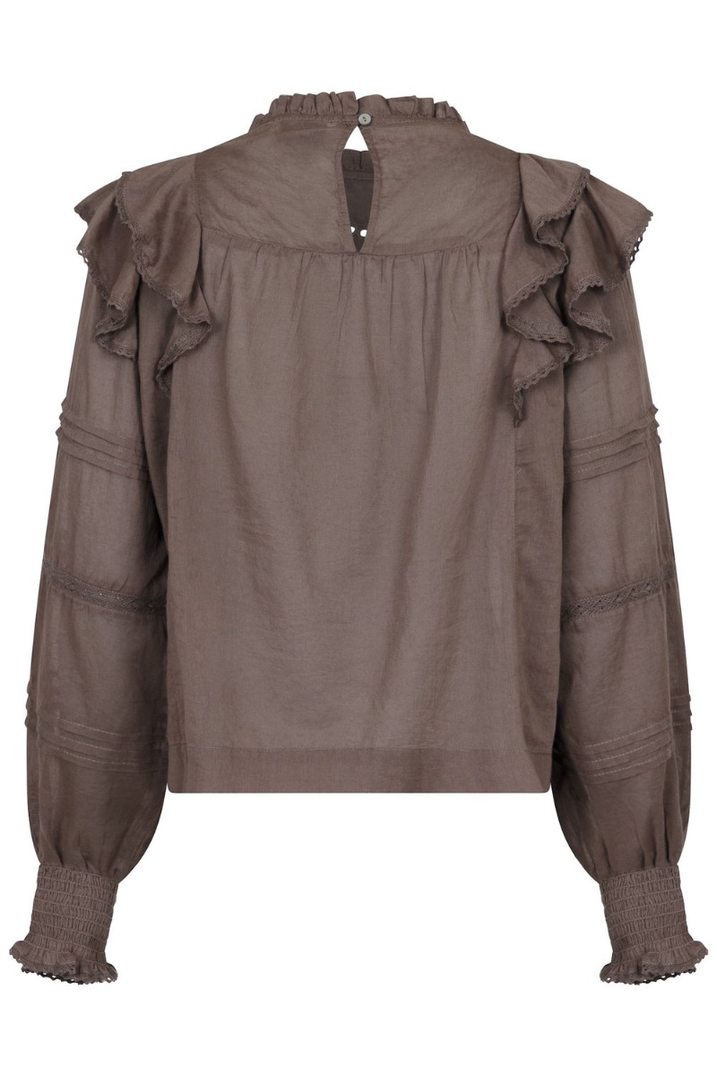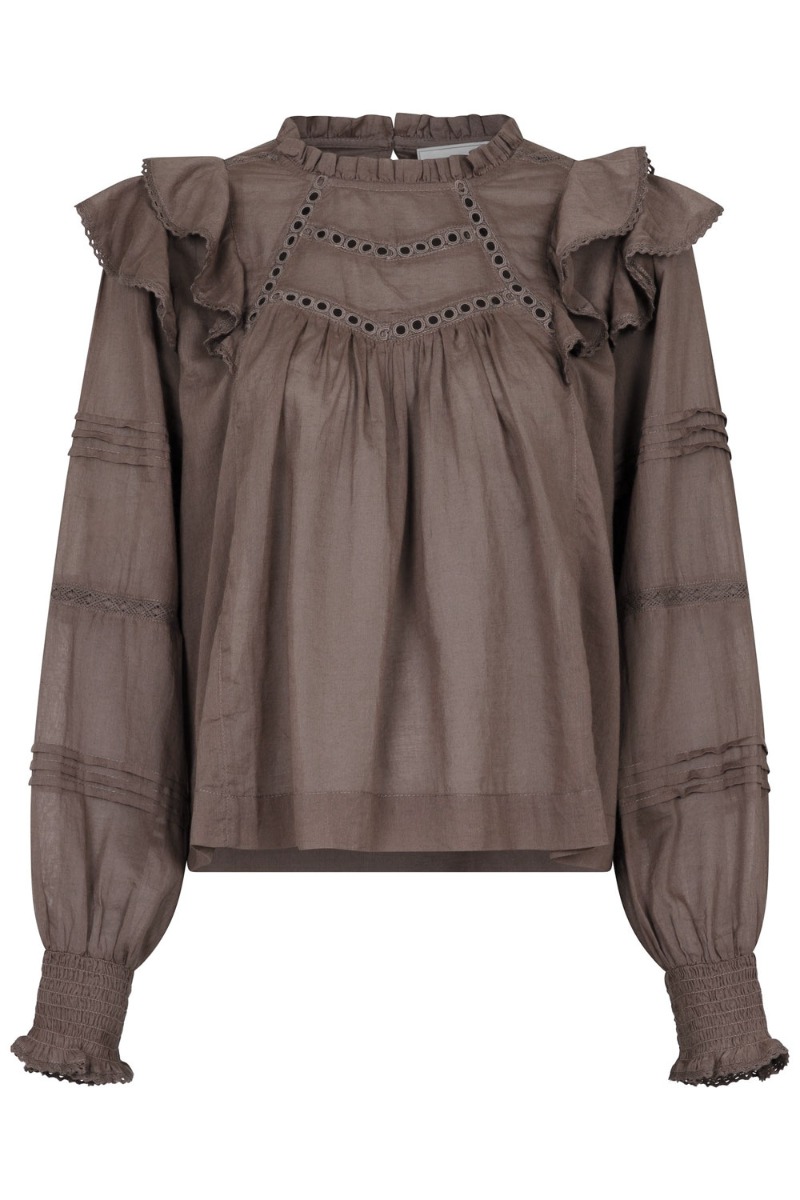 En sød bluse fra Neo Noir er landet i en smuk brun farve. Den er med blondedetaljer ved brystet og på ærmerne. Her er der også sat flæsekanter og bluse lukkes i nakken med en simpel knap. Den er løs i pasformen da den er med A snit og den findes også i hvid.