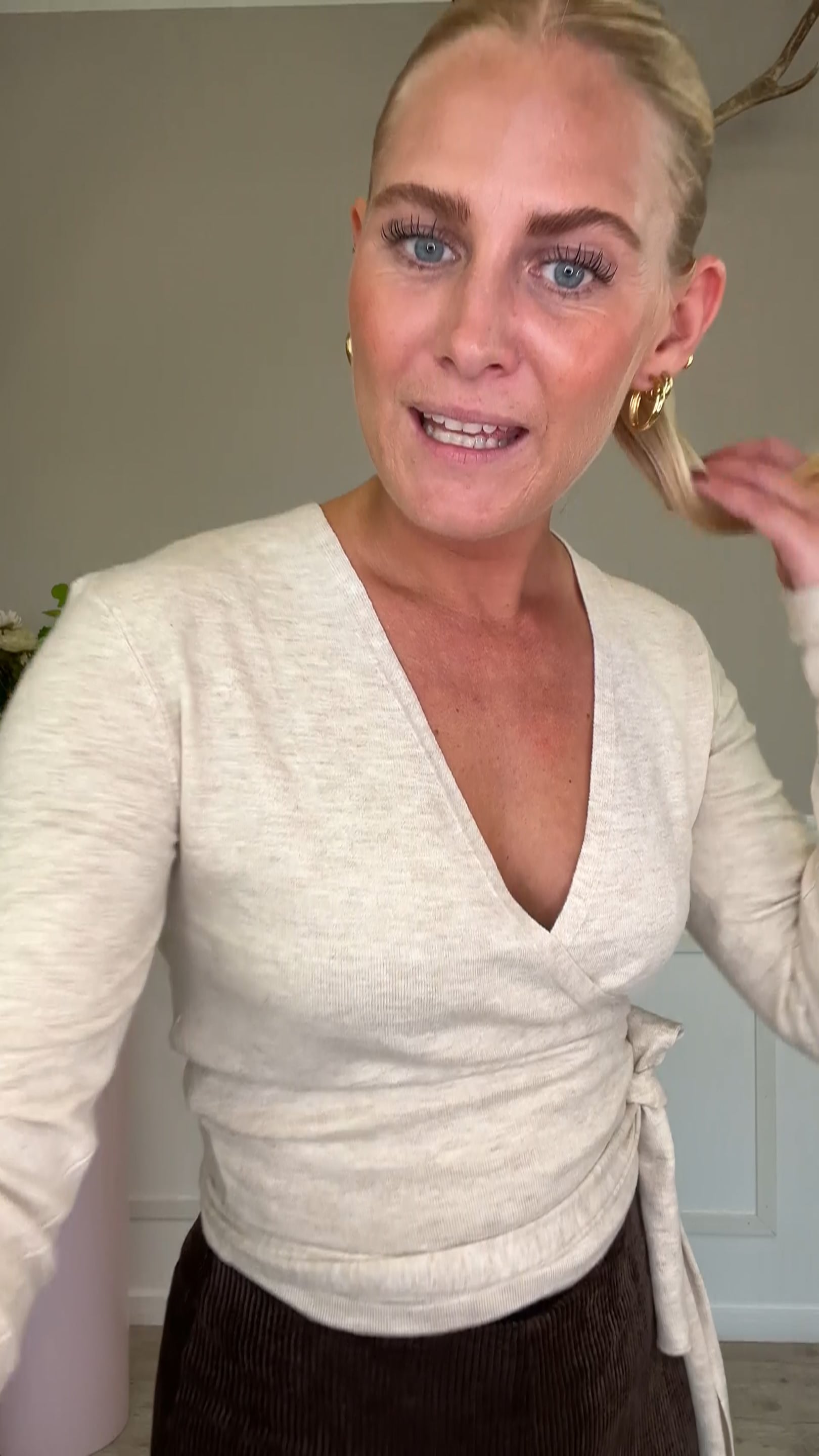 En smuk bluse fra Neo Noir er kommet i denne smukke beige farve. Den er i slå-om model og derfor er den også ammevenlig. Strækkvaliteten gør den også fin til en gravid mave. Den er nem til hverdag med et par leggings og er med til at give dette pilates look.