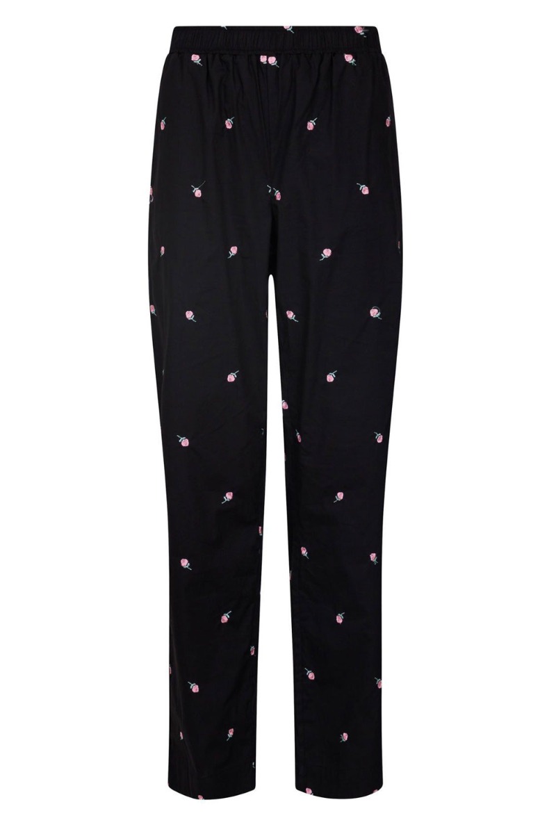 Sorte bukser fra Neo Noir med små broderet lyserøde roser og grønne stilke. Bukserne er lige op og ned med en bred elastikkant i taljen. De er super søde at style med den matchende bluse for at skabe et feminint sæt og kan samtidig bruges helt afslappet med en strik.