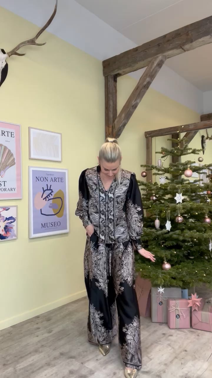Et par smukke bukser fra Neo Noir er kommet til denne sæson. De er sort med et paisley print i en sart rosa. Den er også med vide i benene og har elastik i taljen, men kun bagpå så de stadig er glatte foran. Derudover er der lommer i begge sider som sidder lige ved syningen, derfor er de heller ikke så synlige. Der findes en matchende skjorte til.