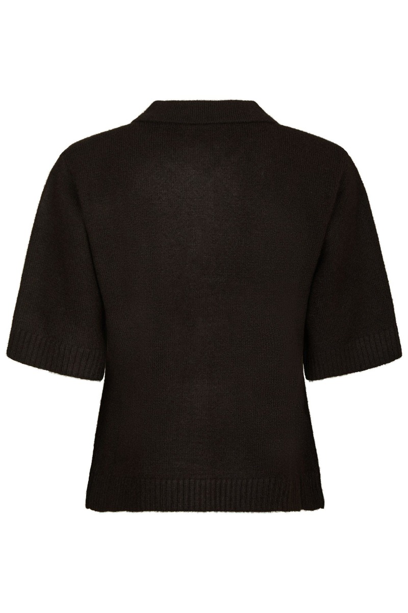 En fin strik top fra Neo Noir med korte ærmer og i denne smukke helt mørkebrune farve. Den er med klassisk skjortekrave og knappes op foran, derfor er den også ammevenlig. Den kan nemt bruges til hverdag med et par jeans eller over en kjole.