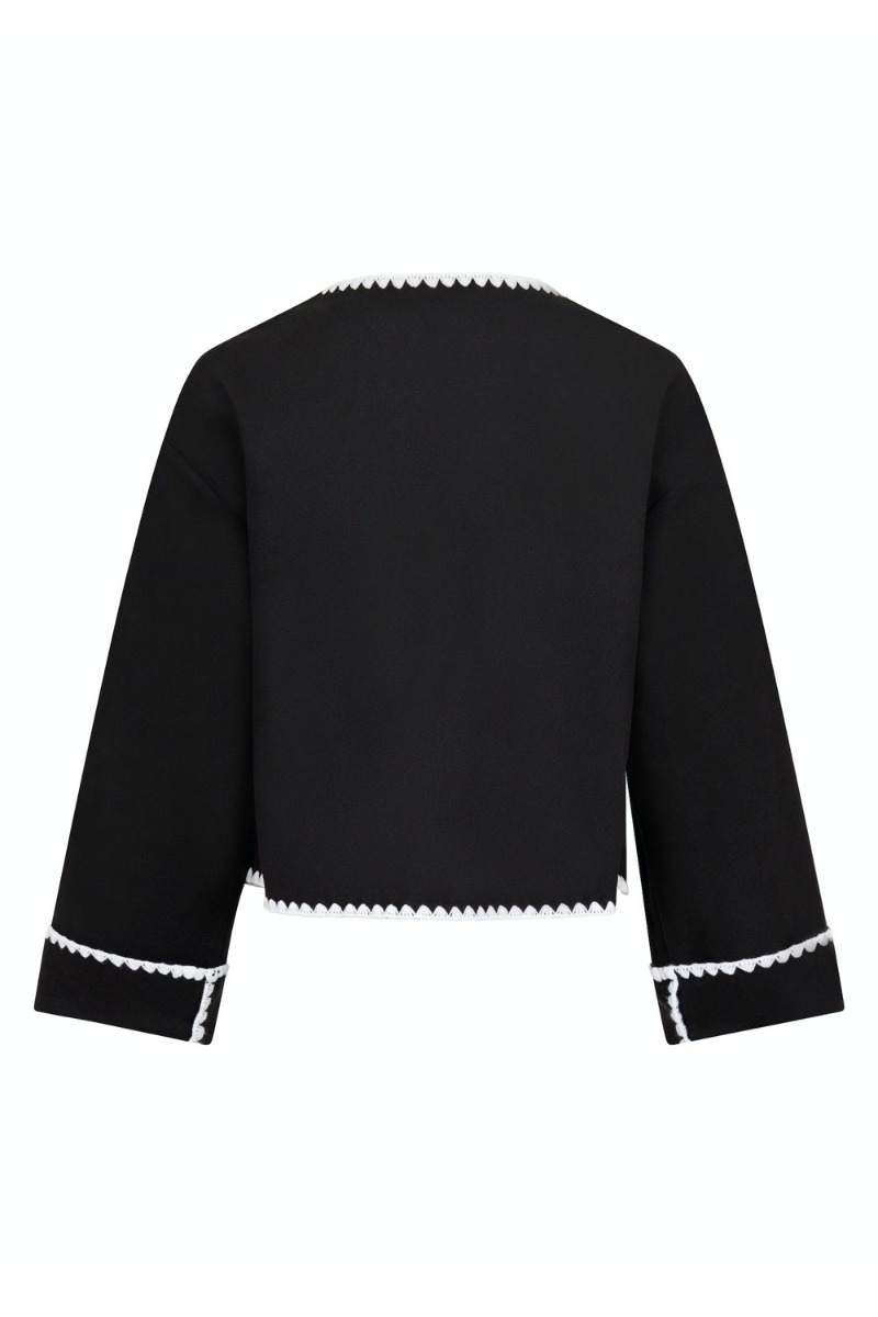 Den fineste jakke fra Neo Noir er sort med hvide kanter der giver et feminint og let udtryk til stylen. Derudover er den løs i pasformen og lukkes foran med to knapper der sidder på indvendig side. Den har lange brede ærmer der afsluttes med en fin foldedetalje. Bruges den gerne som en cardigan her til vinter og som en let overgangsjakke til foråret.