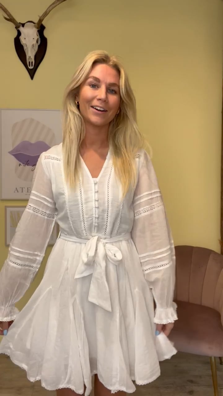Den smukkeste kjole fra Neo Noir i hvid. Den er perfekt til konfirmanden eller studenten - men kan også sagtens bruges som en fin sommerkjole. Kjolen har en masser blonde detaljer på overdelen og skørtet er lavet med ekstra vide i, så det rigtig får denne luftige og puf effekt. Kjolen har lynlås i siden som er skjult og kan åbnes med knapper foran.
