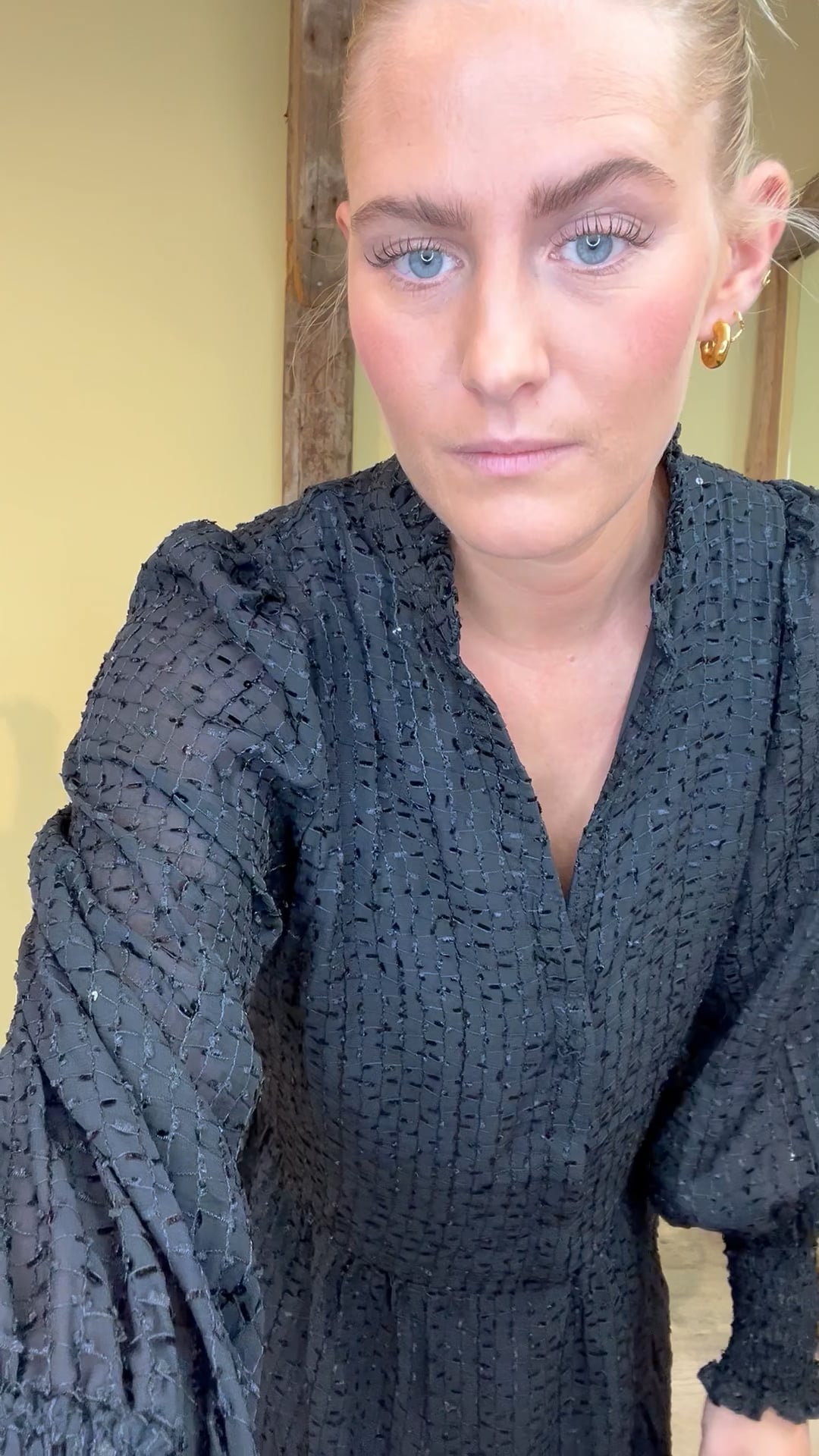Den kjole er en rigtig julefrkost kjole hvis vi selv skal sige. Den er fra Neo Noir og i en sort kvalitet med struktur i stoffet, derfor giver det en smule 3D effekt i ternet mønster. Den er løs i pasformen og har knaplukning til taljen samt V hals. Den er foret så den ikke er gennemsigtig og ballonærmer der afsluttes med smock.