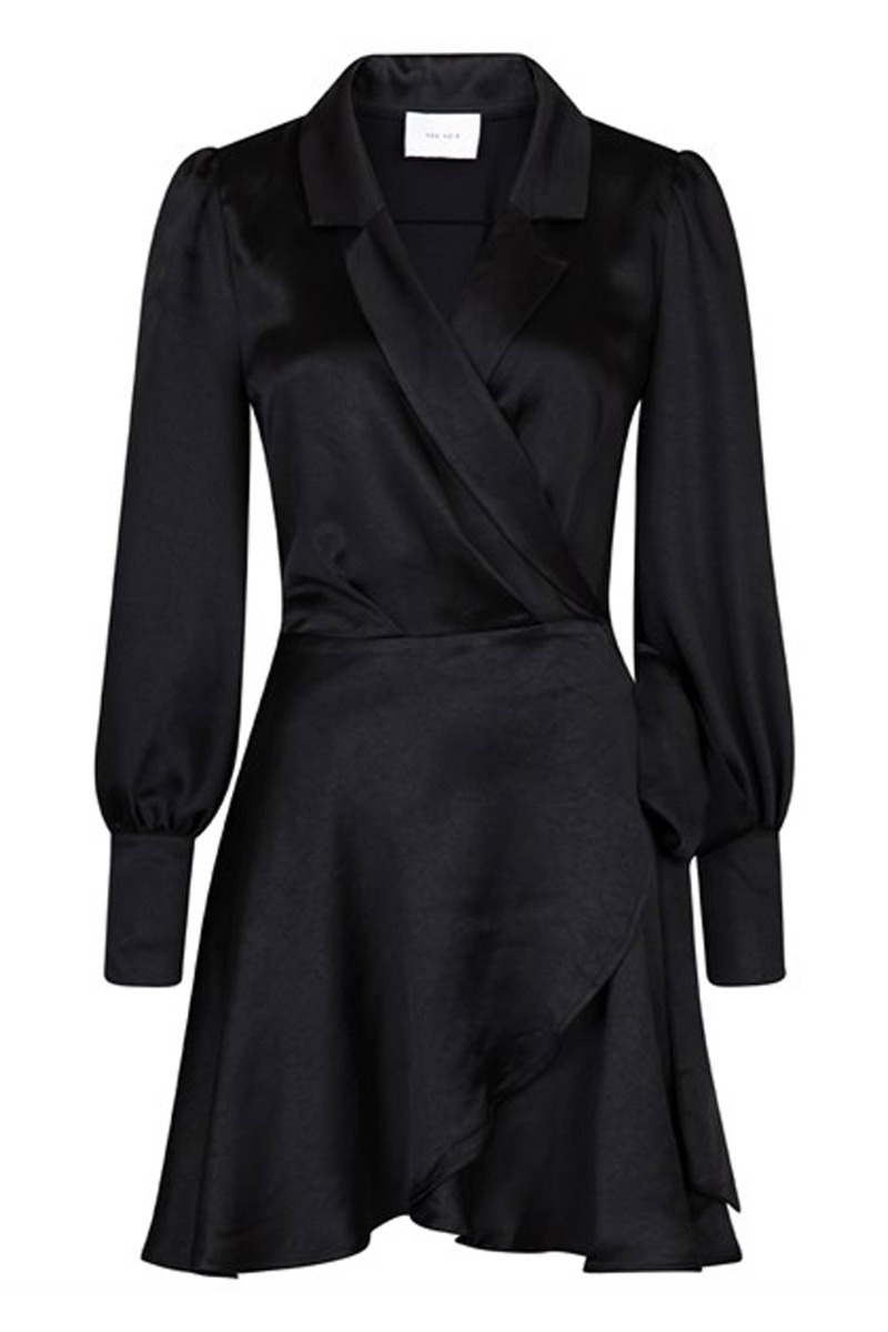 Den nye "lille sorte" fra Neo Noir med slå-om. Kjolen er i en sort draperet satin kvalitet med v-udskæring og skjortekrave. Den har lange ærmer med pufeffekt og et flowy skirt. Kjolen falder utrolig smukt langs kroppen og er det perfekte valg til julefrokost og festlig anledning.