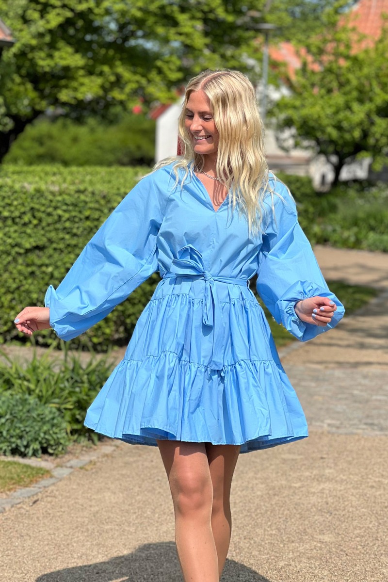 Sød feminin kjole fra Neo Noir i blå med v-udskæring og flæse i kanten af kraven. Kjolen har en sød peplum i bunden og bindebånd i taljen der snøres foran. De lange ærmer afsluttes med en lille elastikkant ved håndleddet der skaber et volumiøst udtryk.