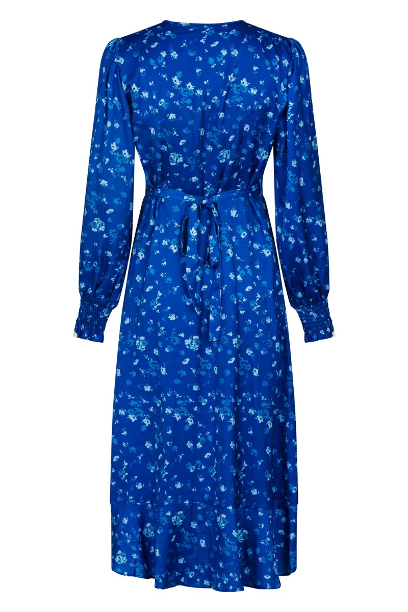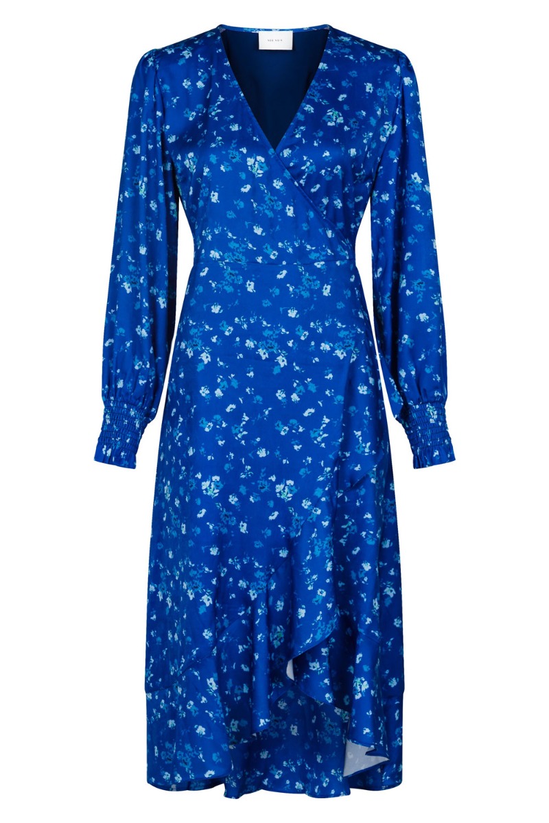 En utrolig smuk kjole fra Neo Noir i den smukkeste blå nuance med små blomster. Kjolen har en glat "silke look a like" overflade, der gør den helt uimodståelig! Den er med slå-om der skaber en feminin v-udskæring og har flæsedetaljer langs kanten. Denne kjole fortjener virkelig en stilet og kan samtidig styles med en rå støvle.