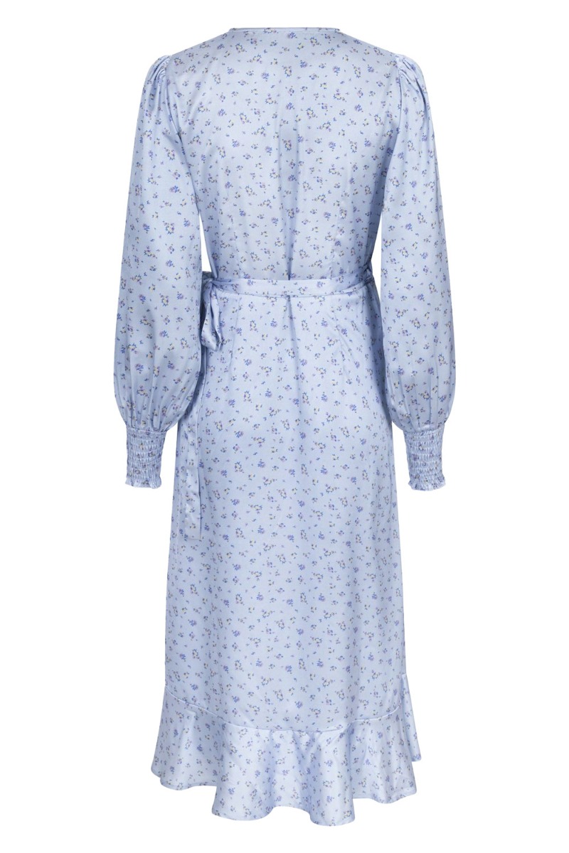 Virkelig SMUK kjole fra Neo Noir i en velkendt model vi ved mange af jer knuselsker! Kjolen er med slå-om der bindes i siden og skaber en feminin v-udskæring og det flotteste fald langs kroppen med en bred flæse i bunden. Bundfarven er i den smukkeste lyseblå farve med et lille blomsterprint i lilla, gule og blå toner. De lange ærmer afsluttes med en bred smock. Style kjolen til alle slags sko og anledninger.