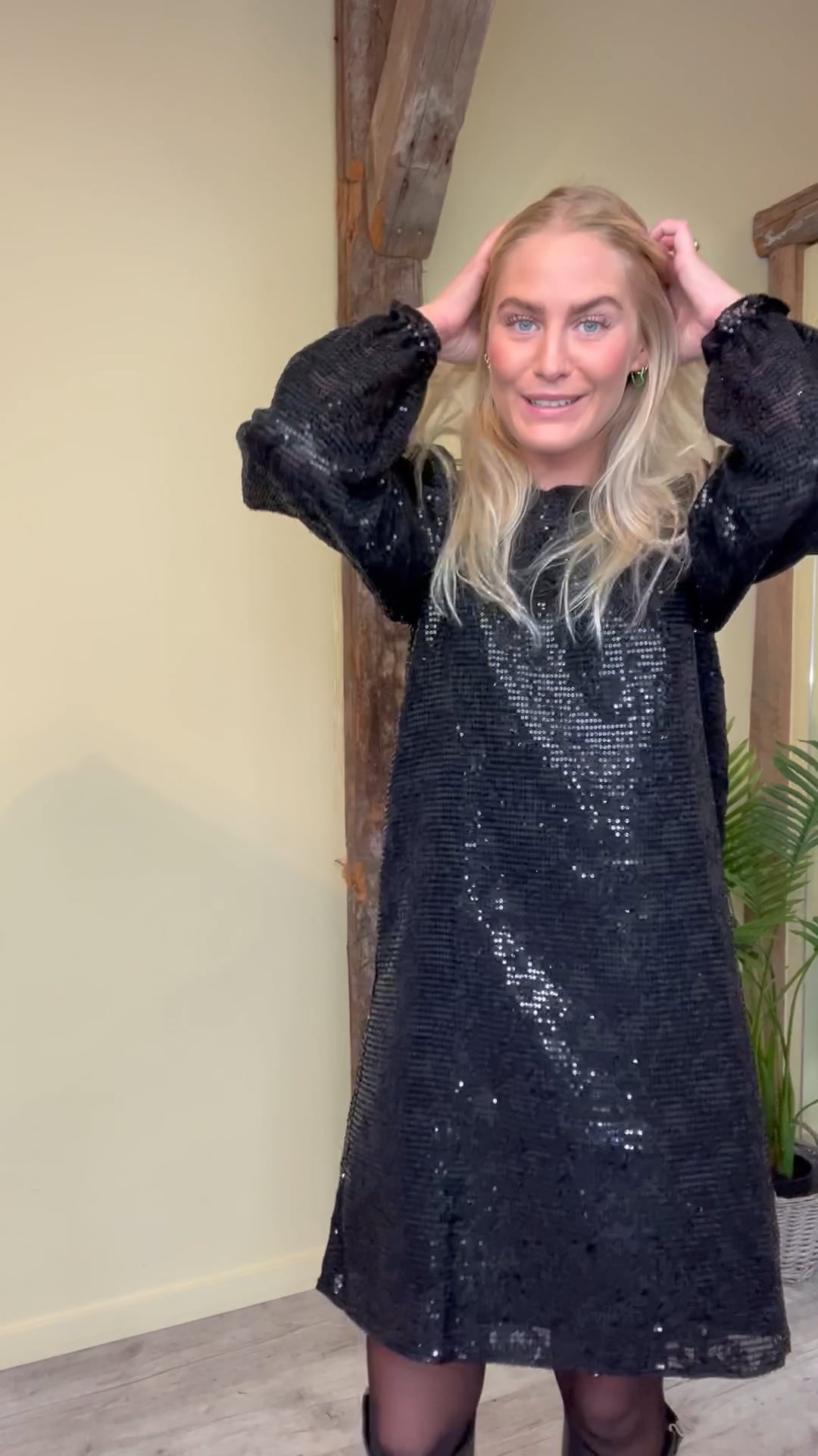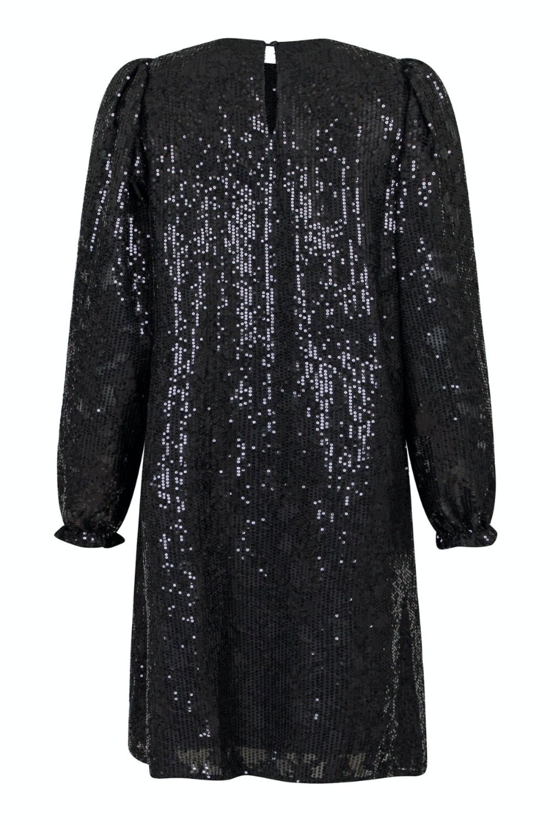 En smuk kjole fra Neo Noir i sort med pailetter som også er i sort. Den er løs i pasformen og har fine ballonærmer med en lille flæsekant i bunden da den afsluttes med elastik. Den er også foret så den ikke er gennemsigtig og lukkes i nakken med en simpel knap. Den er fin til stiletter eller med en strik over så den ligner en nederdel.