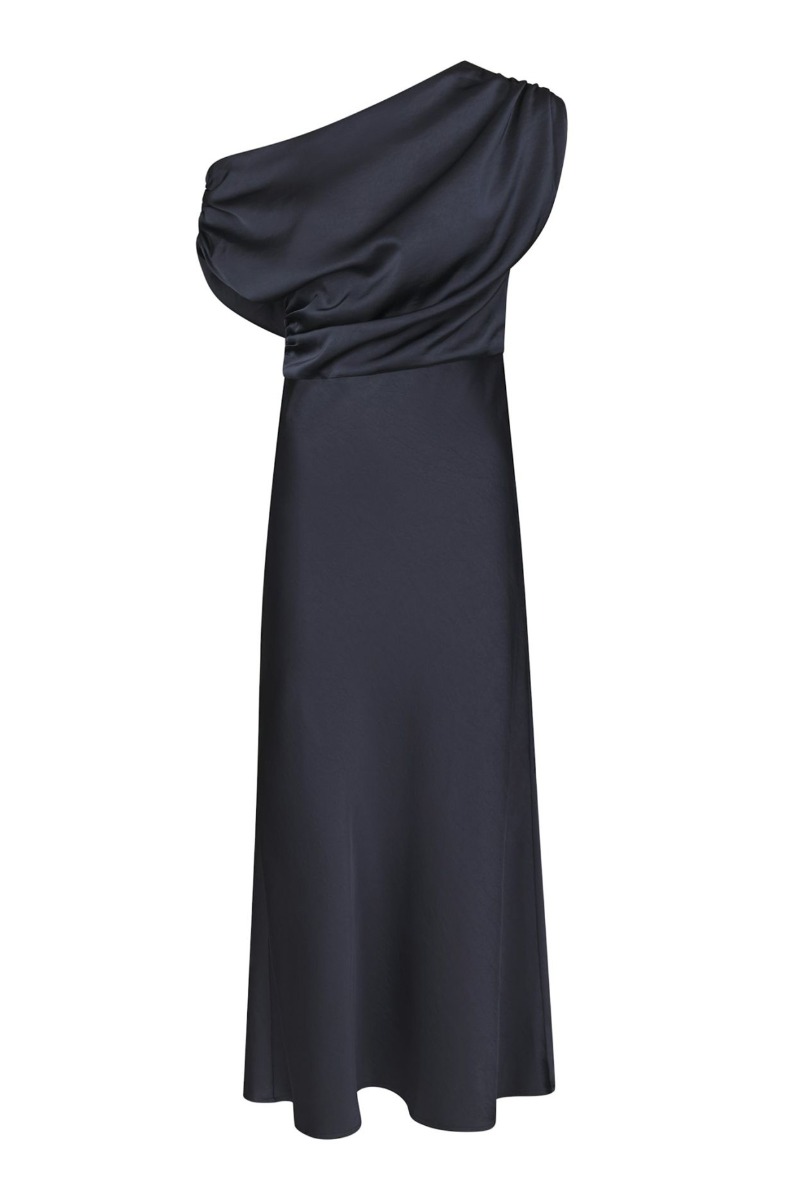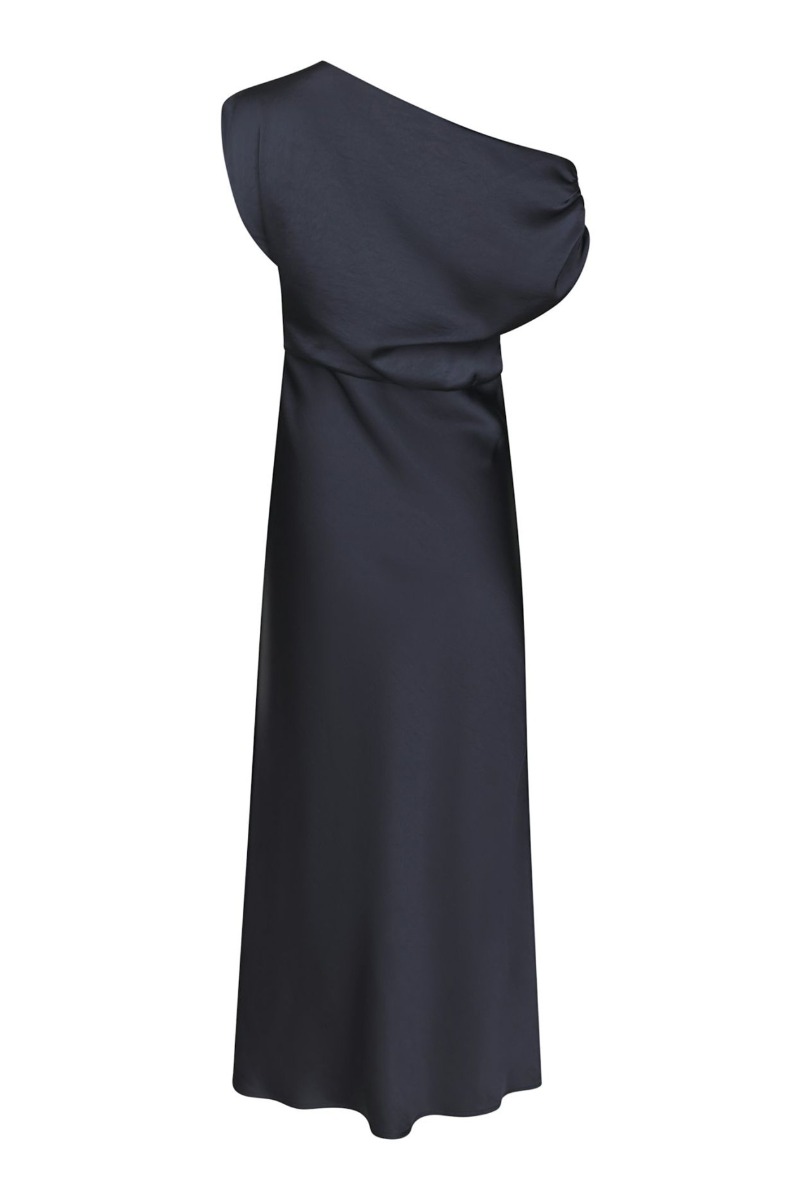 Elegant og sofistikeret kjole i en dyb mørkeblå nuance med en smuk, let skinnende overflade. Kjolen er designet i et eksklusivt og moderne one-shoulder snit, hvor den ene skulder er bar, mens den anden fremhæves af et draperet ærme, der giver volumen og et dramatisk udtryk. Overdelen er smukt rynket, hvilket skaber en flatterende effekt omkring taljen og giver kjolen et feminint og stilfuldt look. Fra taljen falder kjolen elegant i en lang, let udskåret silhuet, som giver et flot og flydende fald. Denne kjole er perfekt til festlige anledninger, hvor et elegant og iøjnefaldende udtryk ønskes. Den kan styles med enkle smykker og høje hæle for et sofistikeret og tidløst festlook.