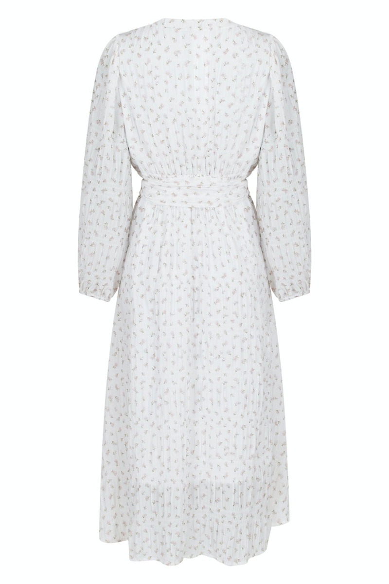 Den fineste kjole fra Neo Noir i hvid med små blomster printet på. Kjolen er lang og med fast syet underkjole så den ikke bliver gennemsigtig. Kjolen har lange ærmer som afsluttes med en tynd elastikkant og giver en anelse ballon effekt. den er syet ind i taljen og der er sat en aftageligt bindebånd. Derudover er den en lille knaplukning foran. Perfekt til en fin aften.