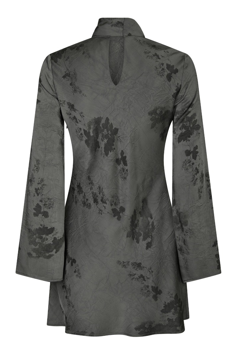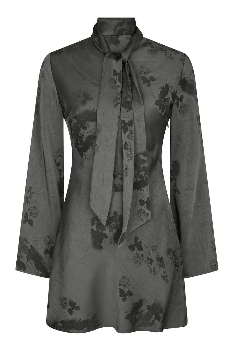 Her kommet altså årets kjole til julefrokoster og andre fester. Den er fra Neo Noir og i denne stålgrå farve med dette blomster motiv. Bindebåndet ved halsen kan bindes både foran og bagpå. Den har lange ærmer med en svaj i bunden. Den høje hals giver også et elegant udtryk.