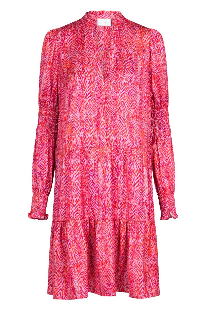 Feminin kjole fra Neo Noir i pink med et grafisk mønster i lilla, orange og pinke nuancer. Kjolen har et løst snit med peplum og knapper foran. De lange ærmer er designet med smock der giver en sød pufeffekt og afslutning på ærmet. Style den med en stilet eller til et par støvler alt efter anledning.