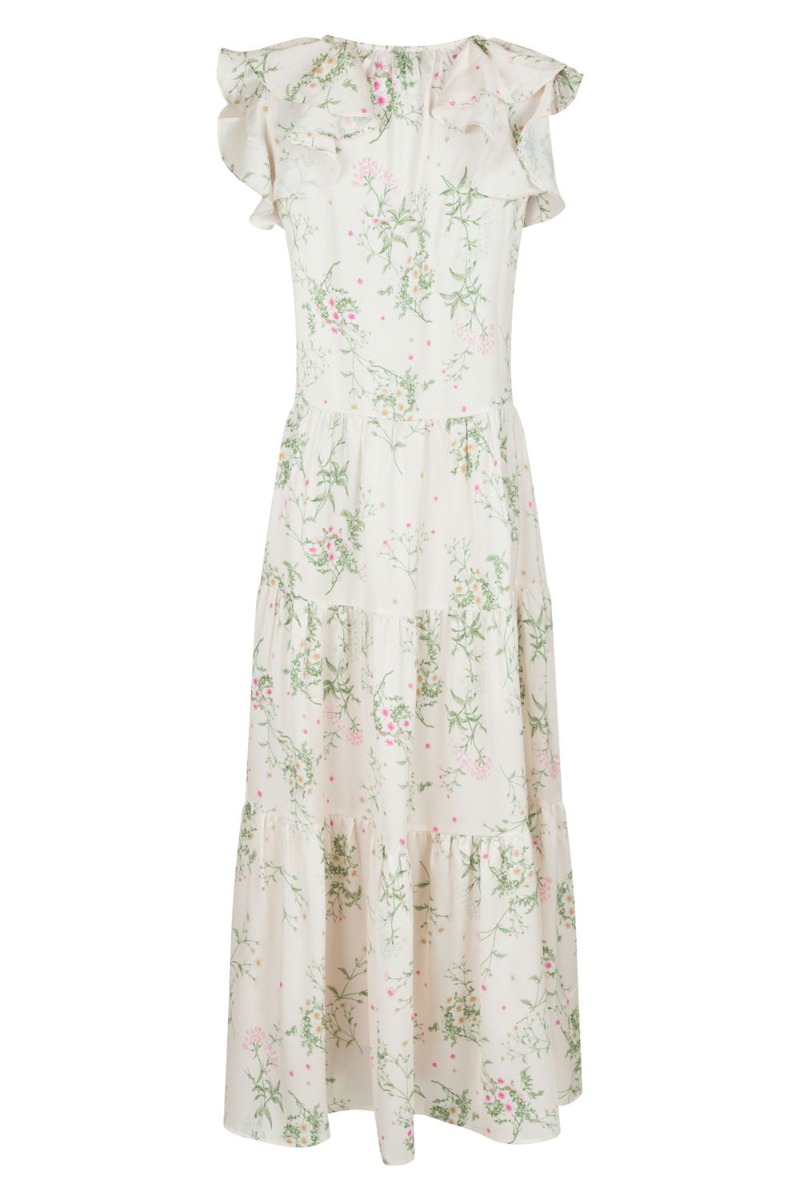En meget smuk kjole fra Neo Noir er kommet i en skøn beige grundfarve med rosa blomsterprint. Den er med flæsedetaljer ved ærmer og ved brystet sidder en lille sløjfe. Derudover er den løs i pasformen og lang i modellen. Der medfølger en underkjole som nemt kan tages ud hvis dette ikke ønskes. Brug den gerne til fest med stiletter eller til hverdag med sandaler.