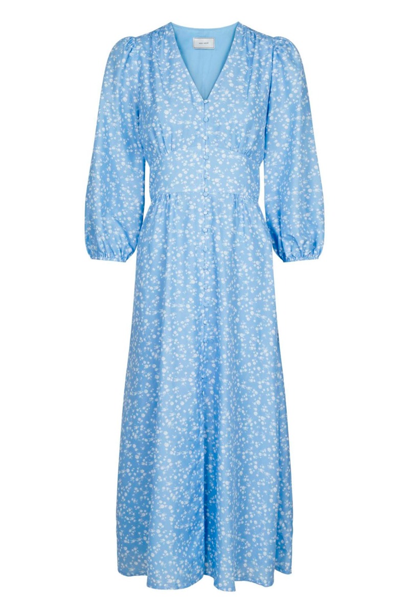 Skønneste lyseblå kjole i det fineste snit fra Neo Noir. Kjolen har et langt smukt snit med små hvide blomster på. Den har en flot v-udskæring med små knapper. Den har 3/4 ærmer som har balloneffekt og bliver afsluttet med elastikkant. I taljen har den et "bælte" som i ryggen har smockdetalje som giver den flotteste effekt og figur på kjolen.