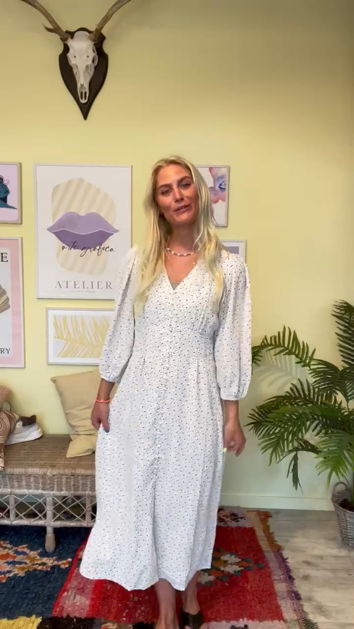 Sødeste sommerkjole fra Neo Noir. Den har en hvid bundfarve og er printet med det fineste blå blomsterprint. En smuk enkel og super feminin sommerkjole. Den har en løs pasform med 3/4 pufærmer med en lille elastikkant. Den har en flot v-udskæring som ender ud i stofbelangte knapper som går hele vejen ned ad kjolen. Den har smockelastik i ryggen som giver den fineste og dejligste pasform. Ved knappernes afslutning i bunden af kjolen danner den en lille slids foran.