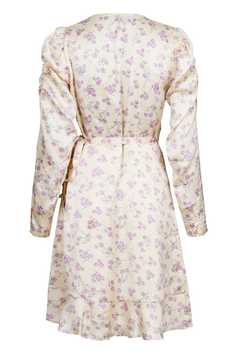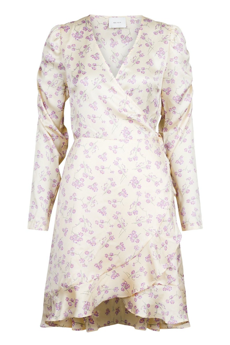 Waauw, en rigtig sommerdrøm fra Neo Noir. Bundfarven er helt sart gul nuance med et feminint lavendel blomsterprint med grønne stilke. Kjole er med slå-om der bindes i siden og skaber den smukkeste pasform med v-udskæring, flæsekant og pufdetaljer. Ærmerne er designet med rynkeeffekt der giver en smuk detalje til den fine sommerkjole. Style med en lilla stilet eller sandal alt efter vejr og anledning.