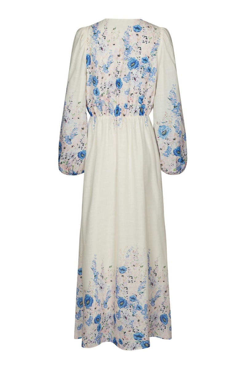 Denne lange kjole er fremstillet i et let og luftigt materiale, der falder smukt og giver en behagelig pasform. Den dybe V-udskæring og den markerede talje skaber en feminin og elegant silhuet, mens de lange ærmer med let volumen tilfører et blødt og romantisk udtryk. Det fine blomsterprint i blå og lyse nuancer giver kjolen et friskt og sommerligt look, som gør den velegnet til både hverdag og festlige anledninger. Kjolen kombinerer komfort og stil og fungerer som et iøjnefaldende, men samtidig tidløst valg i garderoben.