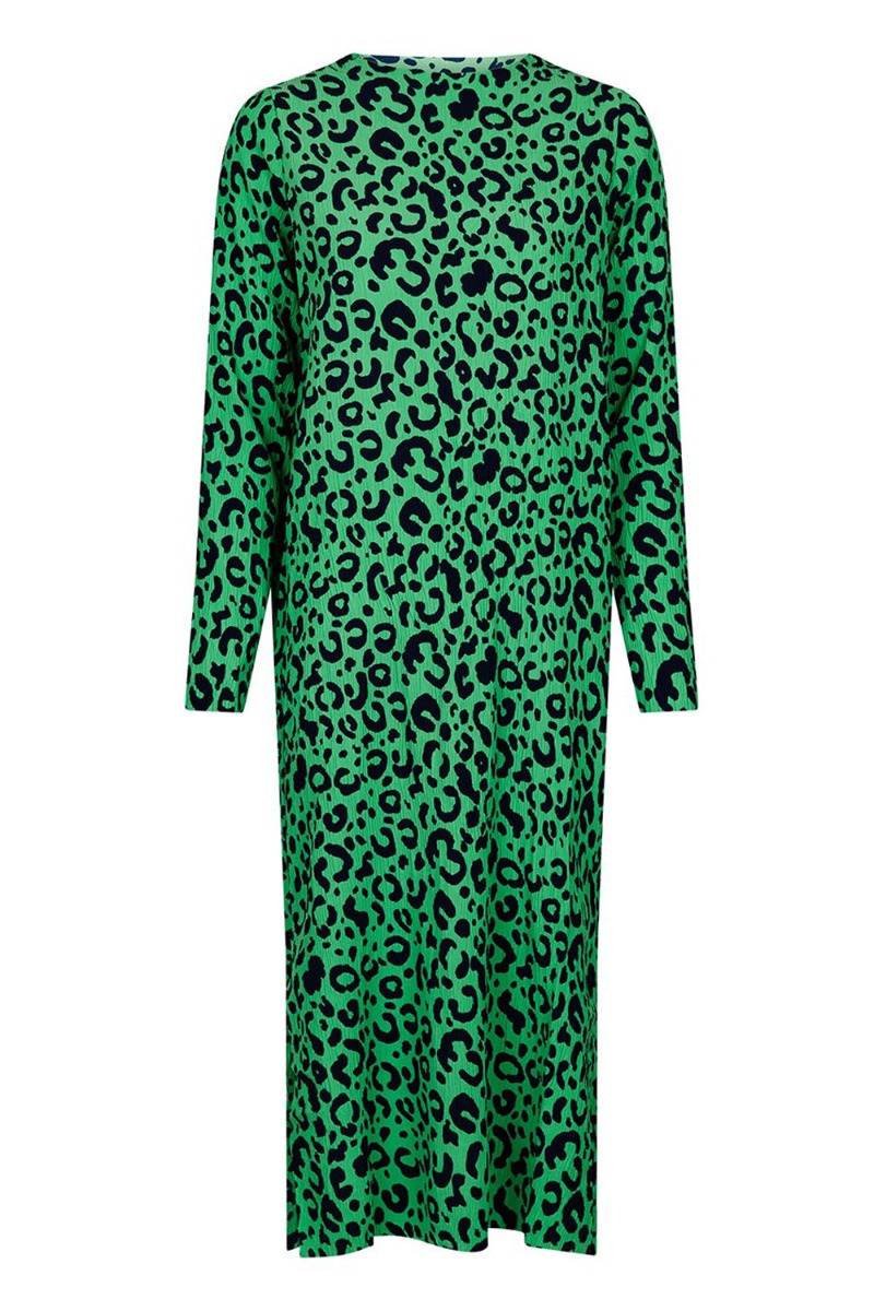 Smuk grøn kjole med sort leoprint fra Neo Noir. Kjolen er lavet i et behageligt plisseret materiale der falder flot langs kroppen med lange ærmer. Den kan styles helt simpelt med en sort støvle og nylonstrømper og kan samtidig nemt dresses op til fest.