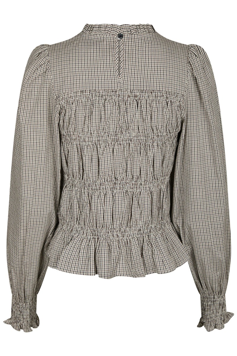Sød bluse fra Neo Noir i ternet print i brune nuancer er kommet til denne sæson. Den er med smock ved brystet og er derfor også tætsiddene samt danner en lille peplumeffekt i bunden, ærmerne er også afsluttet med en fin smock detalje. Den er fin til hverdag med en simple underdel.