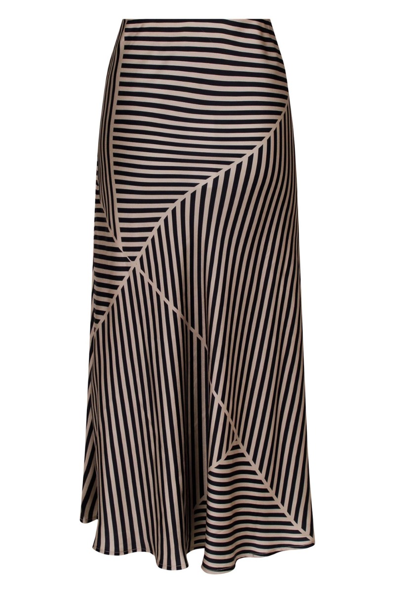 Feminin nederdel fra Neo Noir i stribet mønster med sort og cobber farve. Nederdelen er i et flot a-snit der falder flot langs kroppen i en shine kvalitet. Den har skjult elastikkant i livet og kan styles med den matchende bluse til både fest og mere dæmpet anledninger.