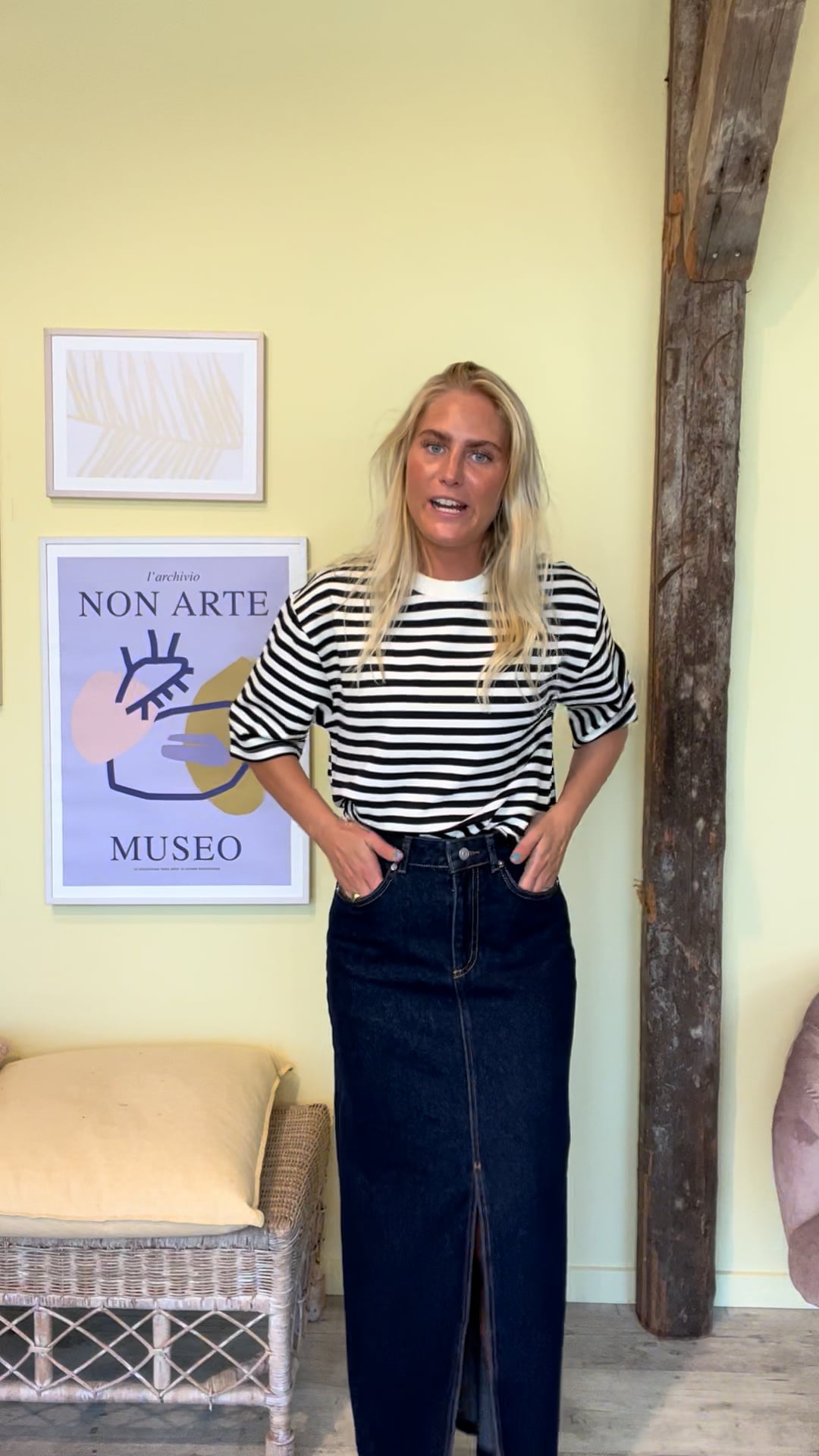 Den velkendt nederdel fra Neo Noir er landet i en ny blå farve. Denne er helt dyb i farve og har stadig de cognac farvet syninger. Kraftig er kraftig denim kvalitet hvor der også er en slids i bunden foran. Den kan nemt brugs sammen med en hvid t-shirt.