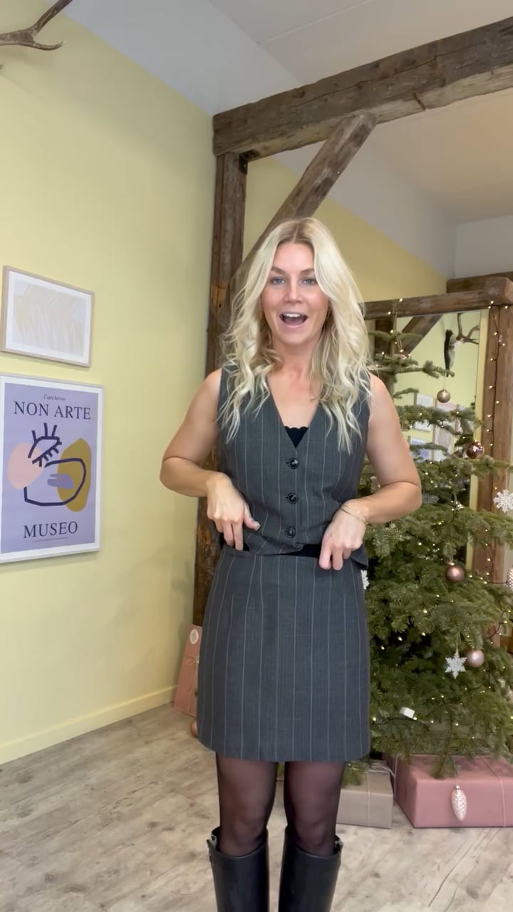 Den fineste nederdel er kommet fra Neo Noir i en smuk grå farve med striber. Den er tætsiddende og går en smule ekstra ind i taljen. den lukkes bagpå med skal skjult lynlås og der findes en matchende overdel til. Den er også fin til en simpel t-shirt eller sammen med en skjorte.