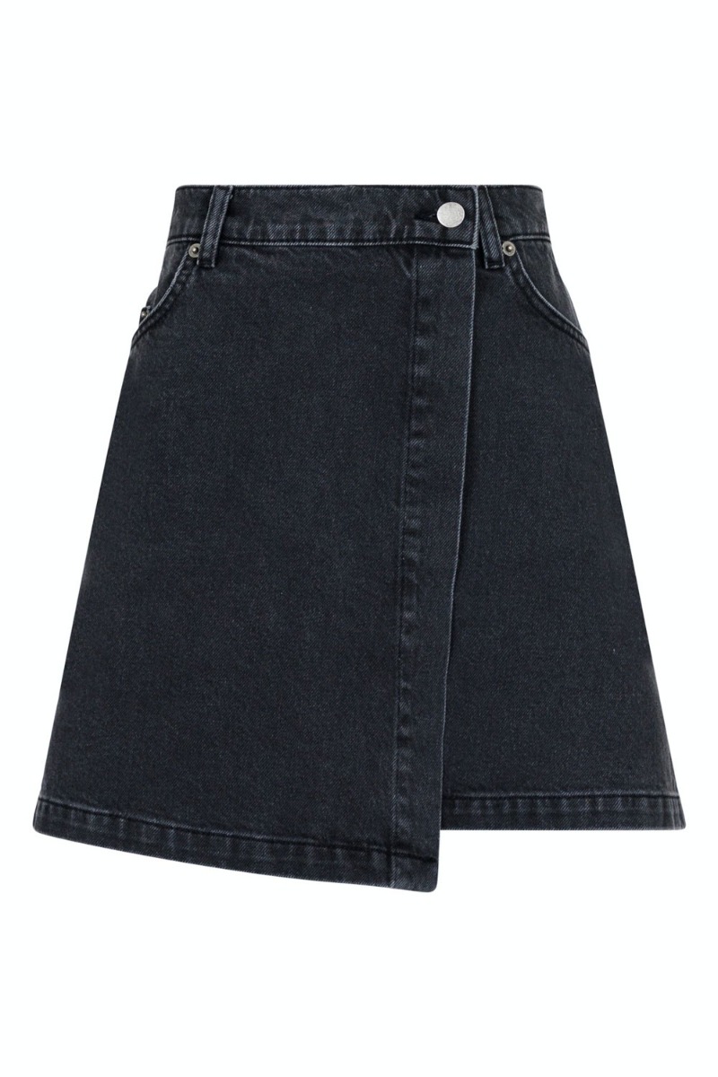 Neo Noir har lavet den sejeste denim nederdel som netop er landet. Nederdelen er i en kraftig denim kvalitet i sort farve - den findes også i en klassisk blå denim farve. Nederdelen er har også slå-om effekt og lukkes med knap både udvendigt og indvendigt. Derudover er der fine lommer foran.