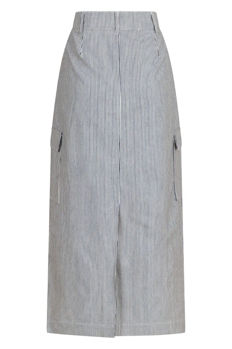 Vi kan slet ikke få nok af de lange nederdele som er en kæmpe TREND her i 2023! Nederdelen er i stribet navy og hvid med fast linning og knaplukning. Den er løs med slids bagtil og super cool at style enkelt med en hvid t-shirt.