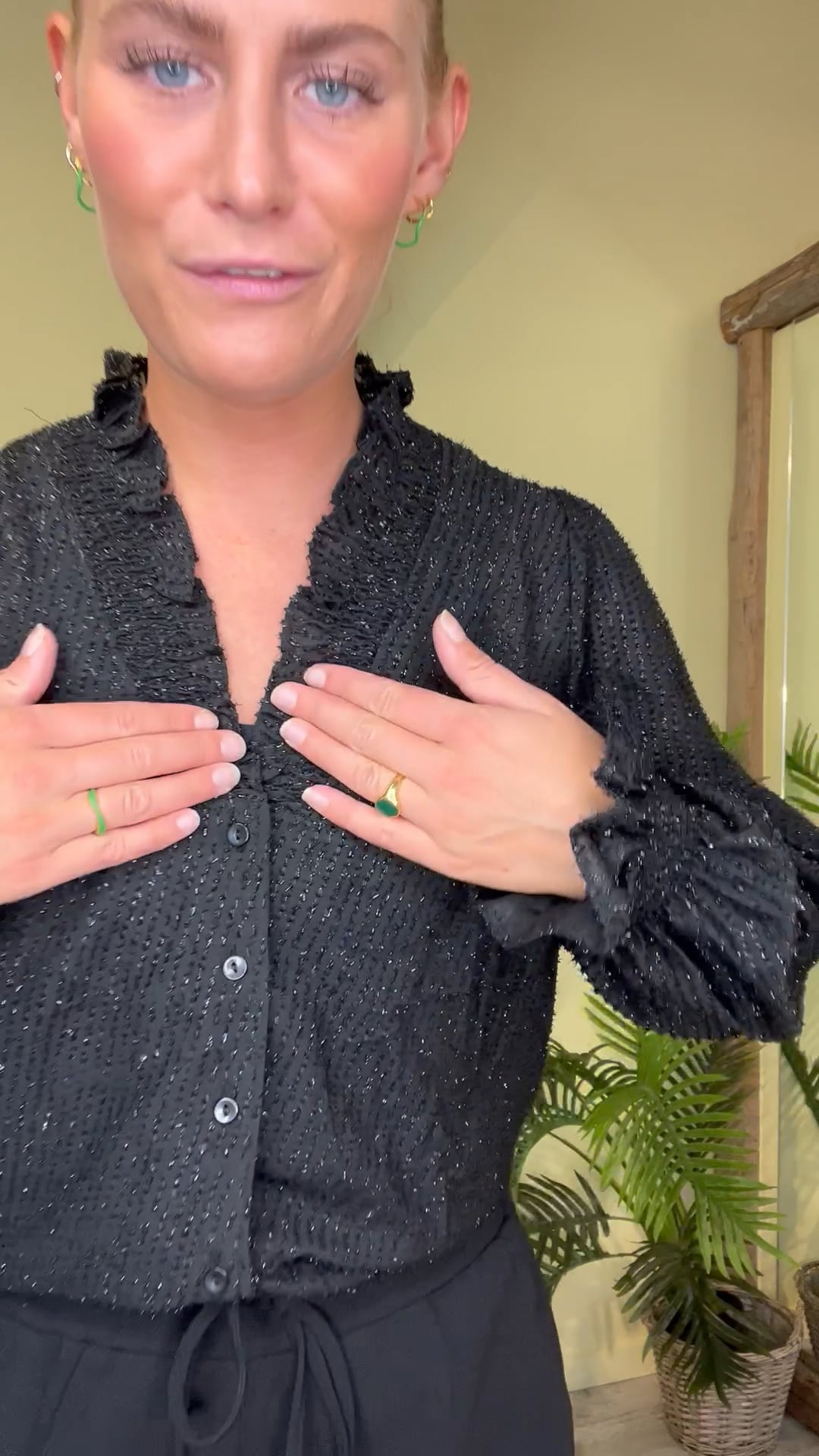 Denne skjorte er super til de kommende fester med glimmer og 3D effekten i stoffte. Den er fra Neo Noir og har knaplukning ned foran samt en V hals. Ærmerne har en smule balloneffekt og aflsuttes med en smock kant som ender i en flæse. Smock effekten er også i halsen kraven.
