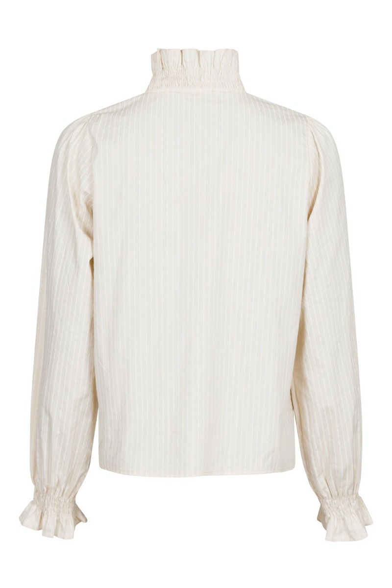En smuk skjorte fra Neo Noir er kommet i en lys beige frave med hvide striber i lodret retning. Den er løs i pasformen og har smock effekt ved ærmer og ved halsen. Den er V halset som markeres med denne smock effekt og en lille flæsekant. Derudover lukkes den foran med en synlig knaplukning.