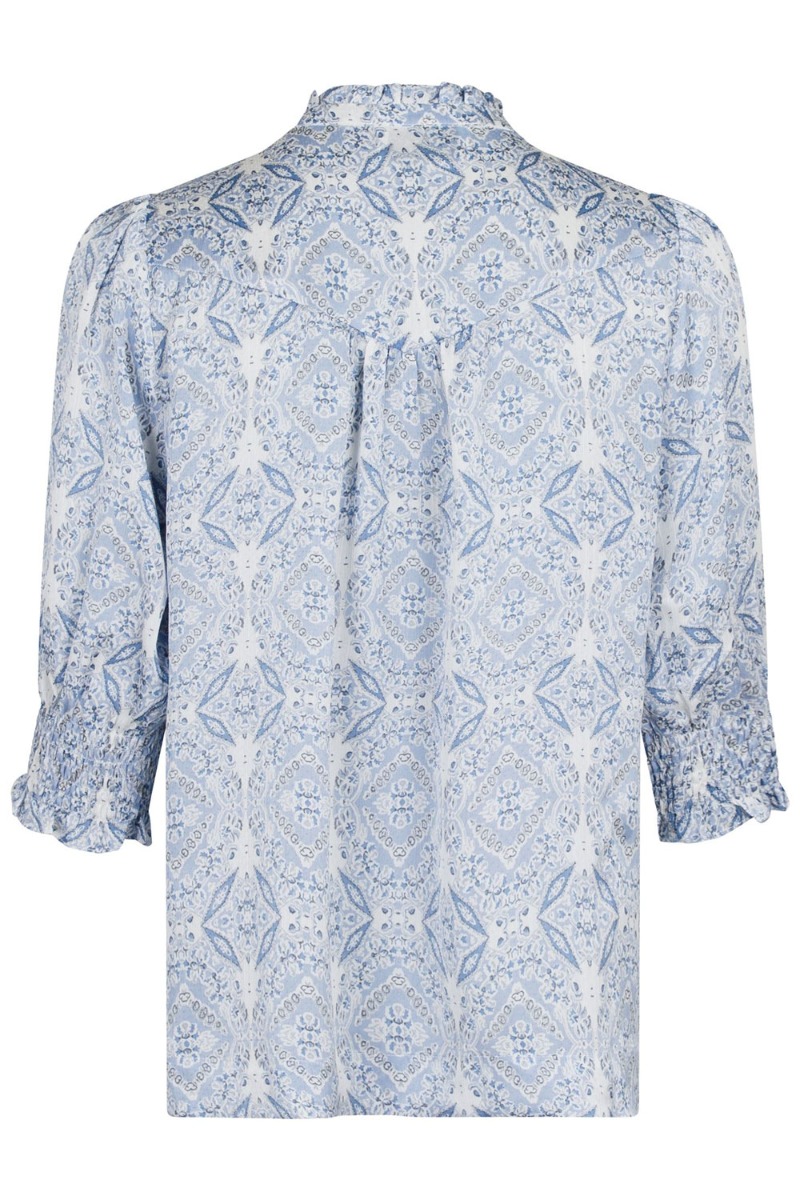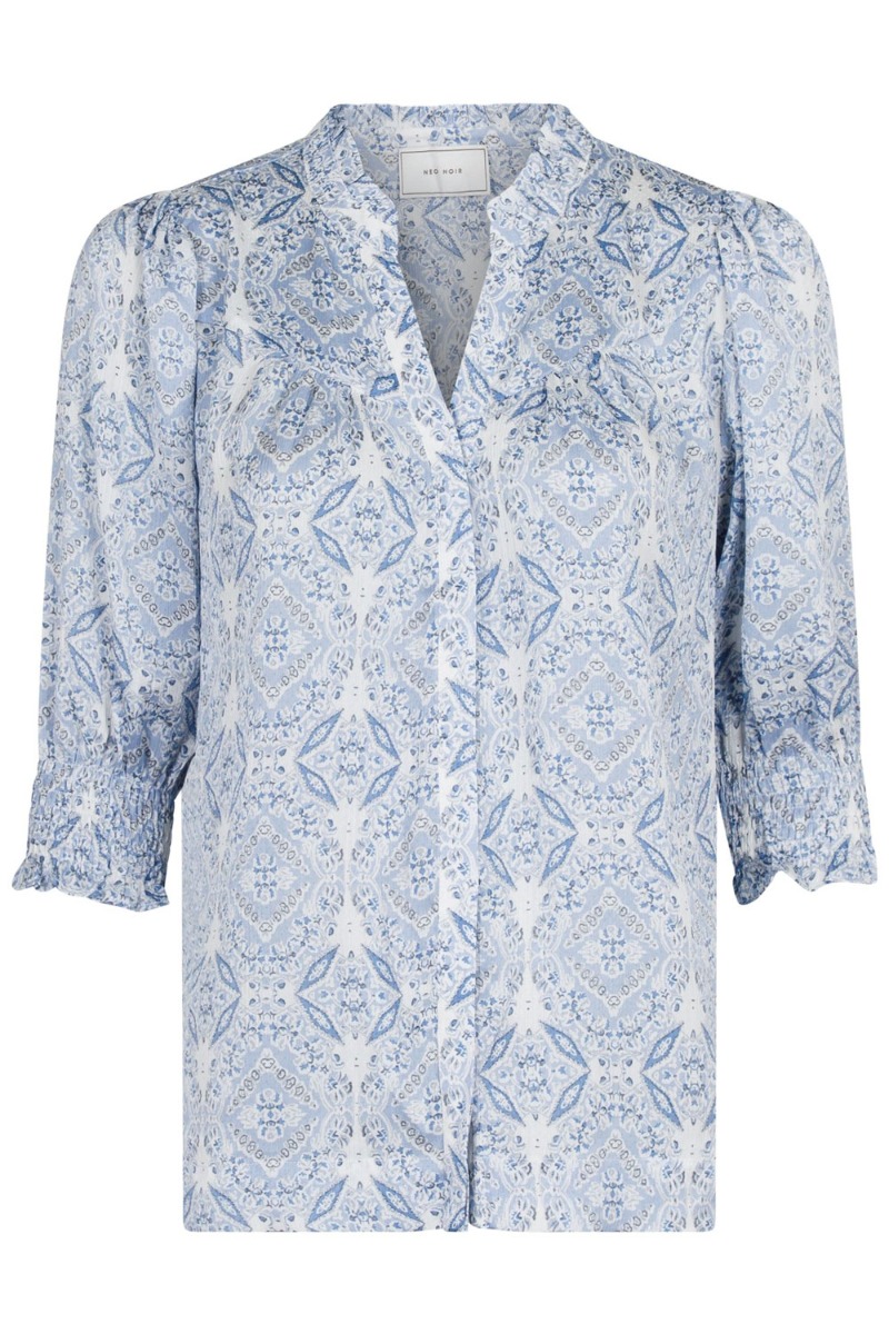 En fin skjorte fra Neo Noir i blåt paisley mønster. Skjorten har 2/4 lange ærmer som afsluttes med en smock effekt. Der er sat en lille flæse ved halskraven og den lukkes med en knaplukning. Den kan bruges både til bukser og nederdel samt kvaliteten er let så man sagtens kan tage en blazer.