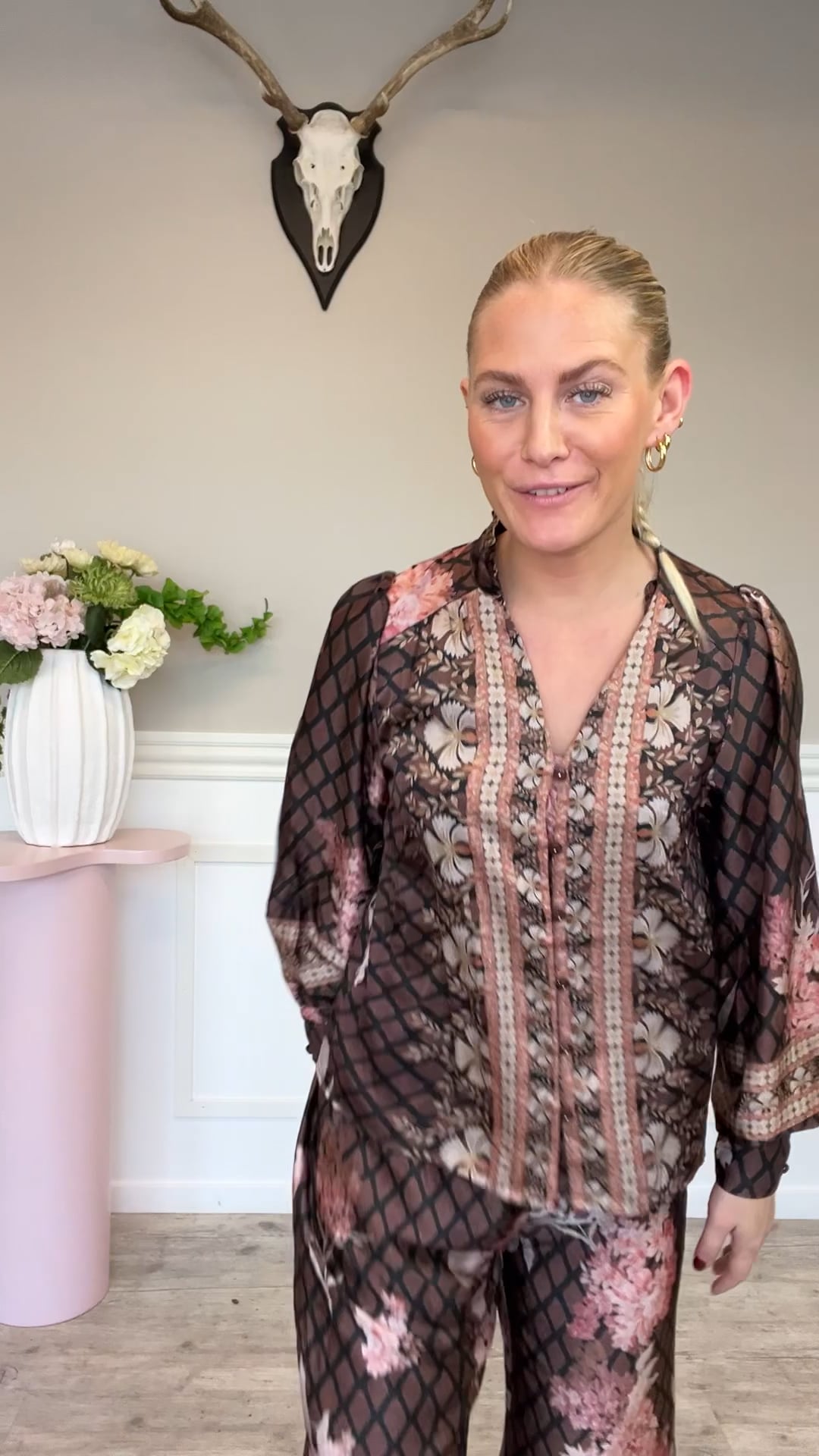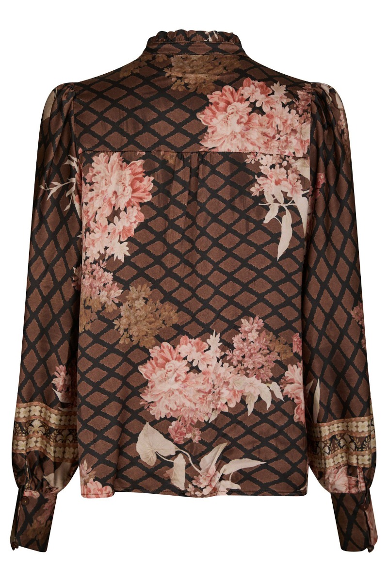 En smuk skjorte som er en velkendt model er kommet i dette smukke brune print. Den er fra Neo Noir med knapper foran og derfor bliver den også ammevenig. Den er i denne satin lignende kvalitet som er helt let og behagelig at ave på hele dagen. Der findes et par matchende bukser.