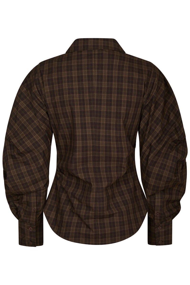 En smuk skjorte fra Neo Noir i dette brun ternet mønster som også er en farve der trender til denne sæson. Den er med knapper foran som sidder skævt fra midten og giver et ekstra twist til dit outfit. Den er med brede ballonærmer og afsluttes med klassisk skjortekrave ved halsen.