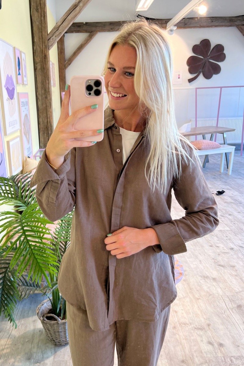 Smuk brun skjorte i en lækker hør kvalitet fra Neo Noir. Neo Noir har lavet denne fine skjorte som passer perfekt til de matchende bukser i samme brune nuance og hør kvalitet. Skjorten er lang med rund bund og helt klassisk krave samt skjult knaplukning.