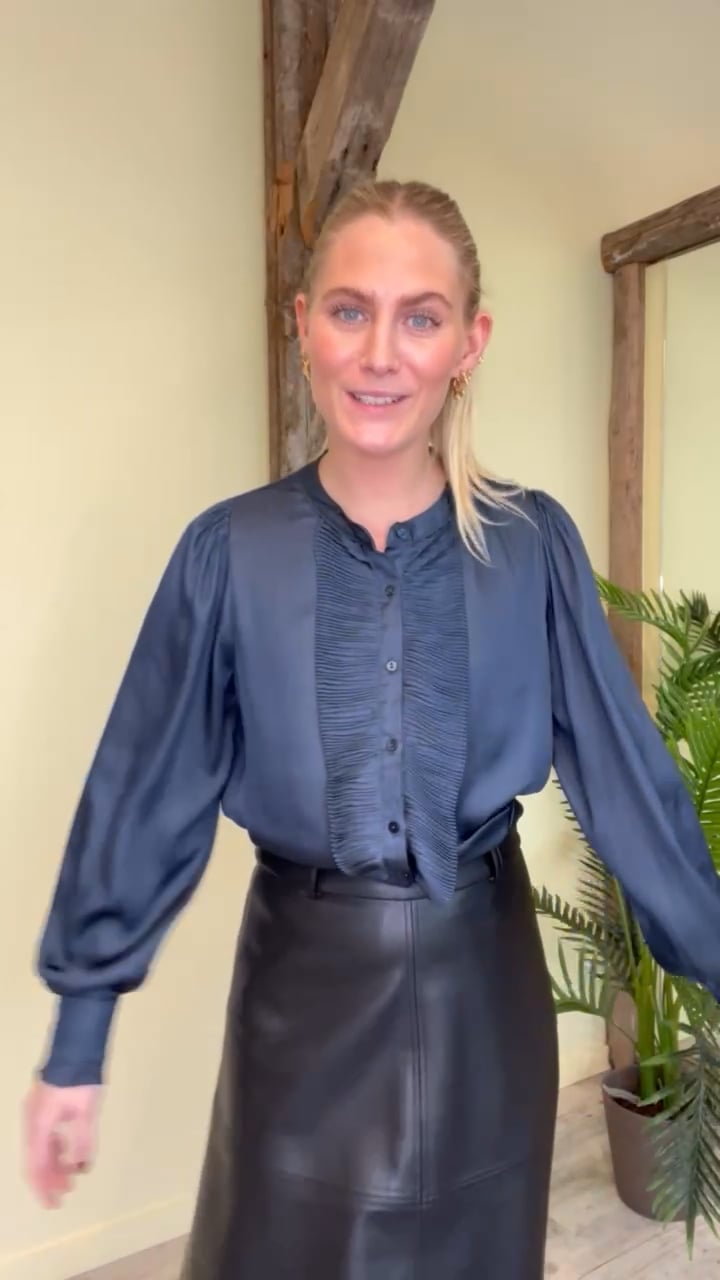 Denne model kender vi fra tidligere fra Neo Noir, den populærer Zola bluse er kommet i en smuk navy farve. Den er stadig i denne tynde kvalitet med satin look. Derudover er der sat en plisseret flæsekant ved knaplinjen foran. Den er kinakrave og ærmerne har en smule balloneffekt. Den findes i flere farver.