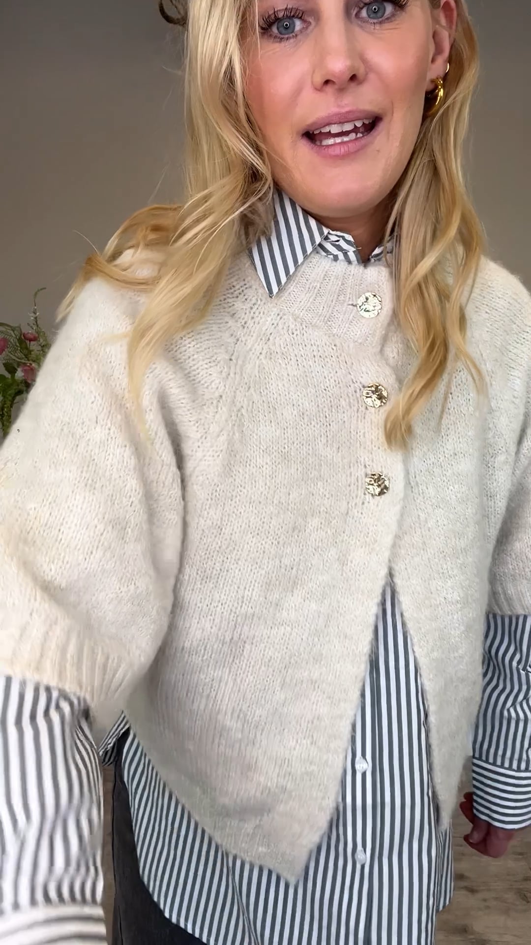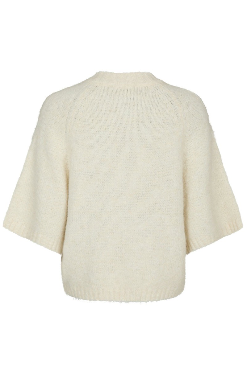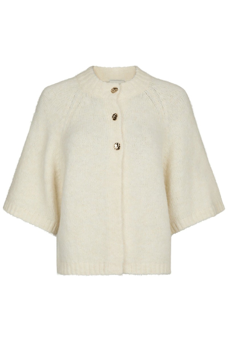Denne cardigan er strikket i en blød og fluffy kvalitet, som giver et varmt og eksklusivt udtryk. Den har en elegant kortærmet pasform med rund hals, der gør den nem at style over både toppe og kjoler. Foran lukkes den med fine gyldne knapper, som tilfører et feminint og sofistikeret look. Den klassiske offwhite farve gør den let at kombinere med både lyse og mørke nuancer. En alsidig strik, der passer perfekt til både hverdagsbrug og pænere anledninger.