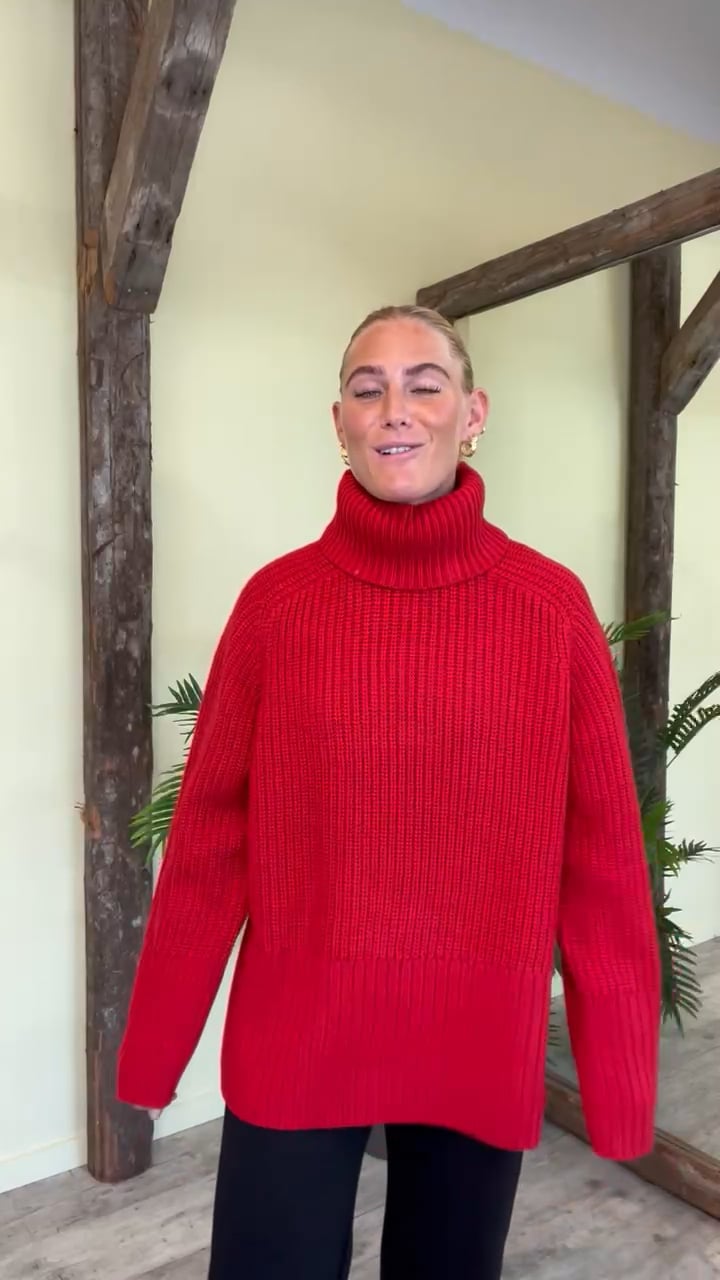 Efteråret står for døren og derfor er denne smukke røde strik fra Neo Noir altså et must til garderoben! Strikken er super behagelig og rummelig, og har en ribkant forneden med en slids i hver side. Den kan både bruges til et par bukser eller udenover en kjole.