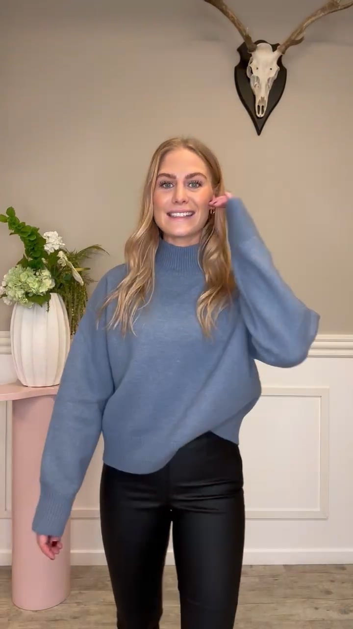 En fin strik fra Neo Noir er kommet i en blå farvenuance. Denne model kender vi fra tidligere, men er nu som sagt landet i en ny farve. Den er helt tæt i strikken og dejlig blød i kvaliteten. Den er løs i pasformen og går en smule op i halsen samt den har brede løse ærmer.