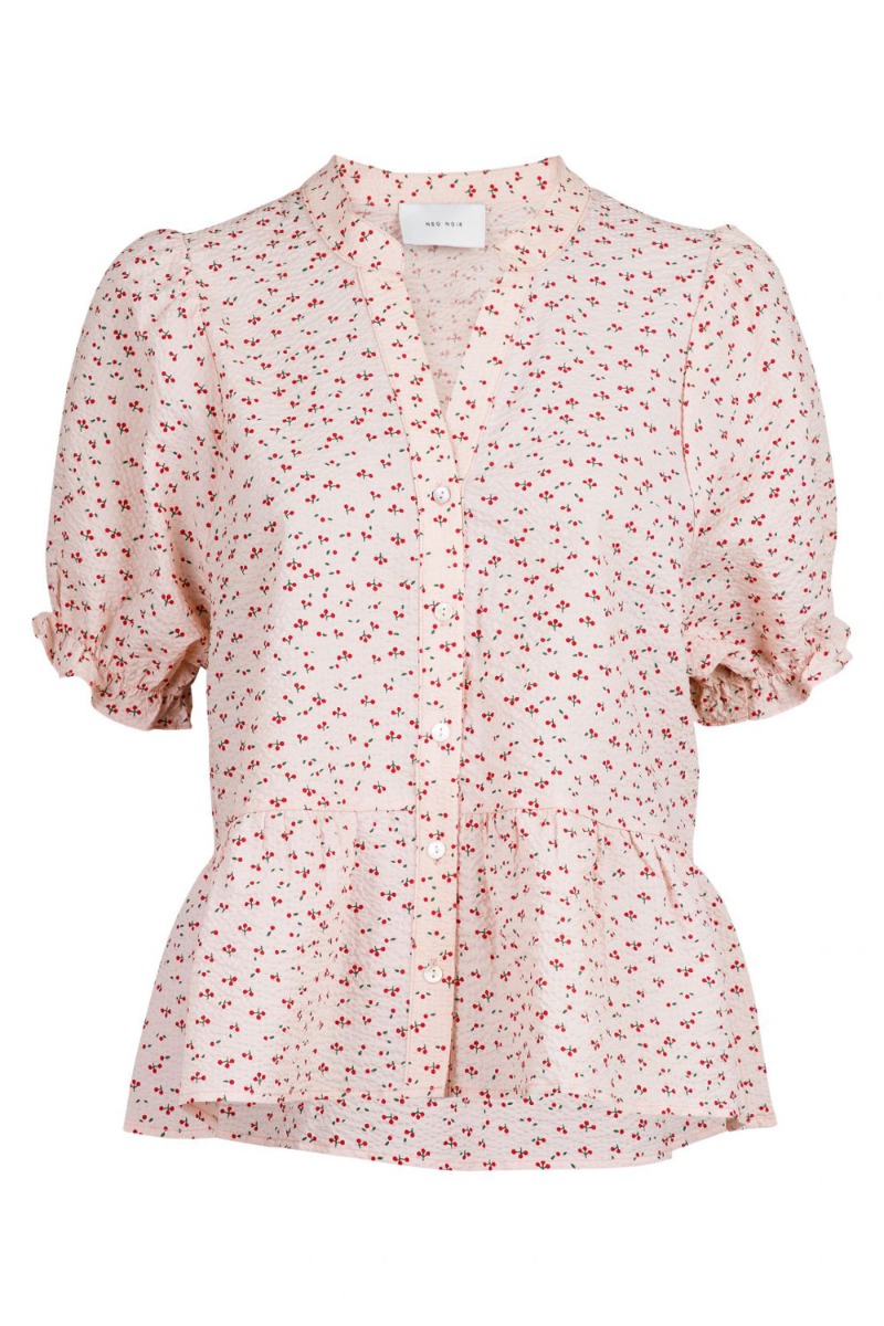 Smukkeste fine t-shirt fra Neo Noir i helt sart rosa med små kirsebær. T-shirten har peplum i bunden, en lille v-hals der lukkes med knapper og korte puffærmer med flæsekant. Den er super sød at style med de matchende bukser i samme kirsebær print for et fuldendt sommerlook.