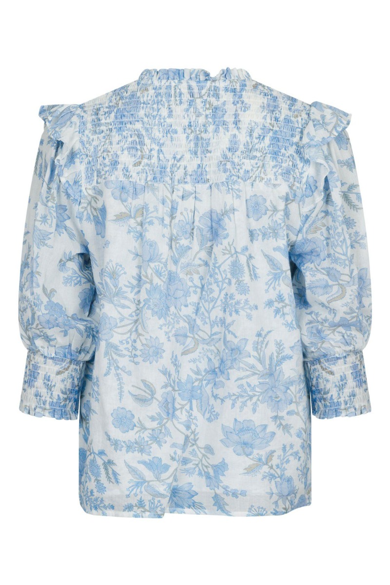 En fin top fra Neo Noir er kommet til denne sæson i blåt blomsterprint. Den er med smukt blomsterprint og kan nemt bruges til hverdag med et par jeans eller til et apr shorts. Den har 2/4 lange pufærmer og har en lille. V hals der markeres med en flæsekant. Den er løs i pasformen og findes også i gult.