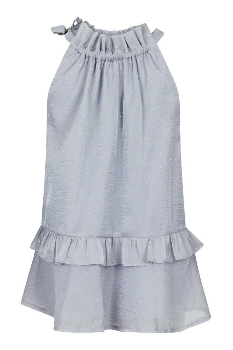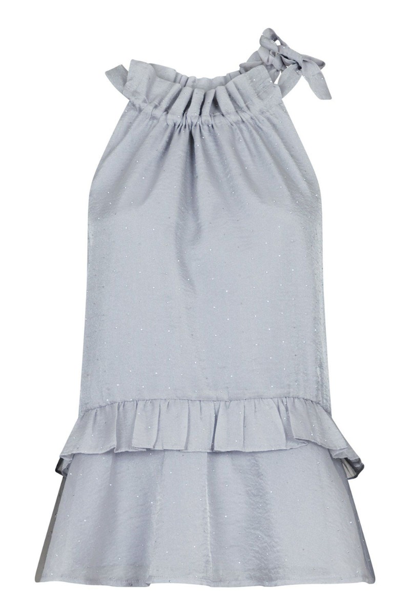 En små top i grå med pålimet sten fra Neo Noir. Den er med en fin flæsedetalje ved halsen som har et bindebånd der kan snørres ind som det ønskes. Den er deruodver løs i pasformen og har også en flæsekant i bunden. Den er også foret så den ikke er gennemsigtig og den passer til alle underdele.