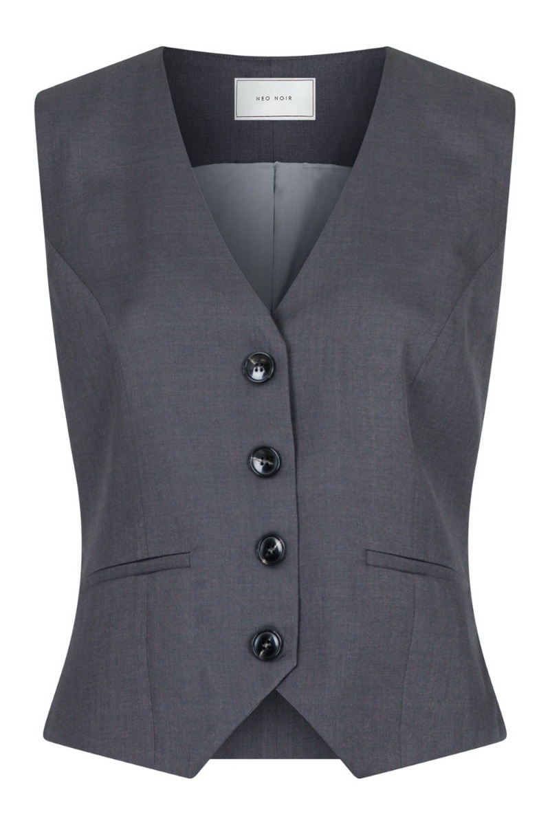 En fin habit vest i grå er kommet fra Neo Noir. Den lukkes foran med fire knapper og har snydelommer også foran. Den kan bruges med en t-shirt under eller bare som den er til en fin nederdel eller dine favorit bukser. Derudover er den foret i en glat kvalitet og derfor behagelig at have hele dagen.