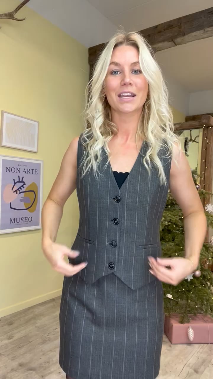 En sej vest er kommet i et gråt ternet print fra Neo Noir. Den er en del af et sæt, så der findes en matchende nederdel. Den kan bruges som den er eller med både t-shirt eller skjorte under. Den er lavet i en dejlig blød kvalitet og lukkes foran med knapper. Derudover har den dette habit look og kan bruges både til hverdag og fest.