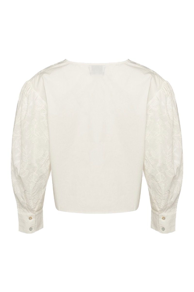 Fin bluse fra Noella i hvid med slå-om og de fineste broderet blomster. Blusen har flæsekrave og lange ærmer med knapper ved håndleddet. Den kan både styles til fest og hverdag.