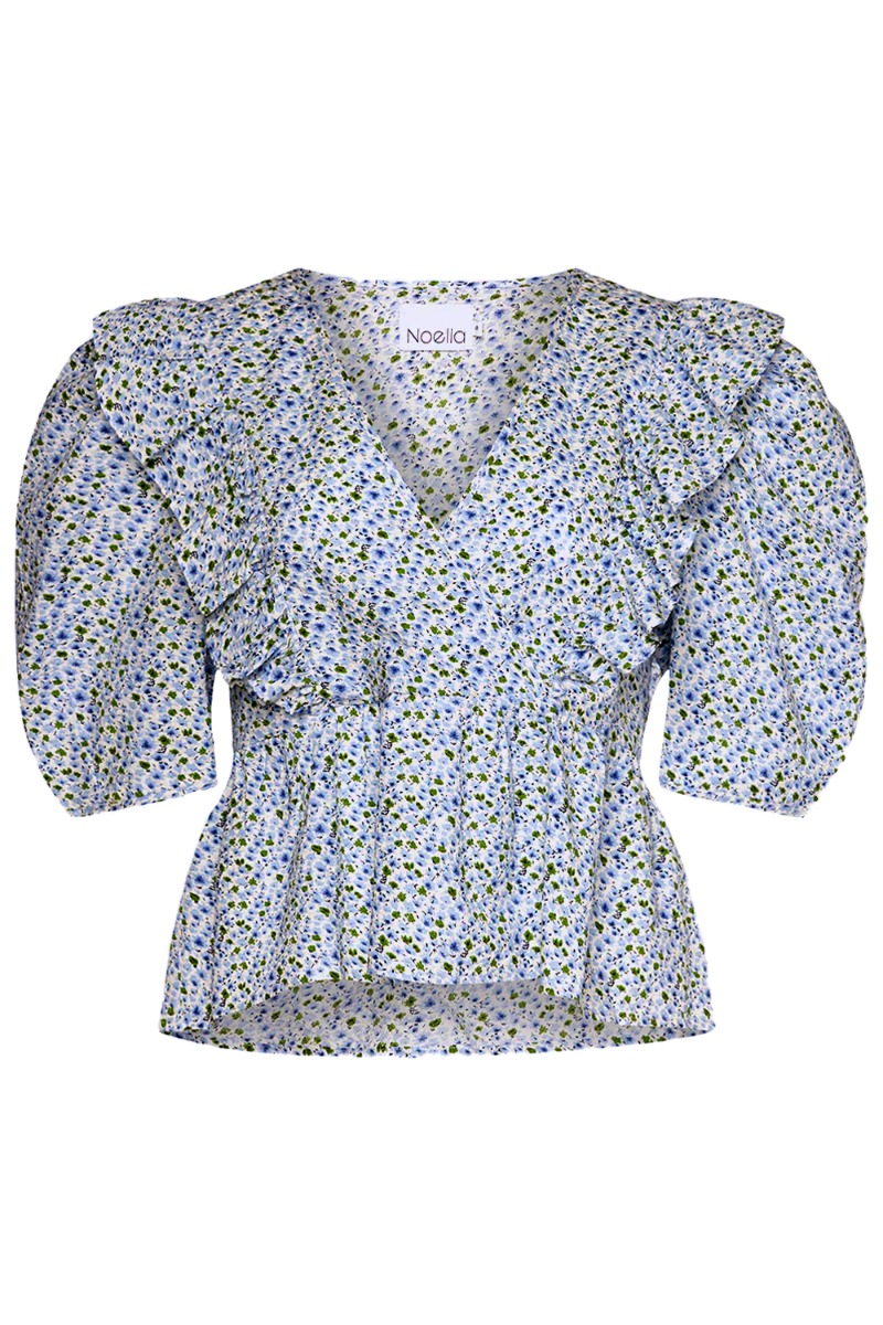 Fin sommerbluse fra Noella i blomsterprint. Blusen har en sød pasform med peplum i bunden og flæsedetaljer ved kraven. De korte pufærmer giver en feminin effekt og er super sød at bruge både til pænere brug og hverdag alt efter din styling.