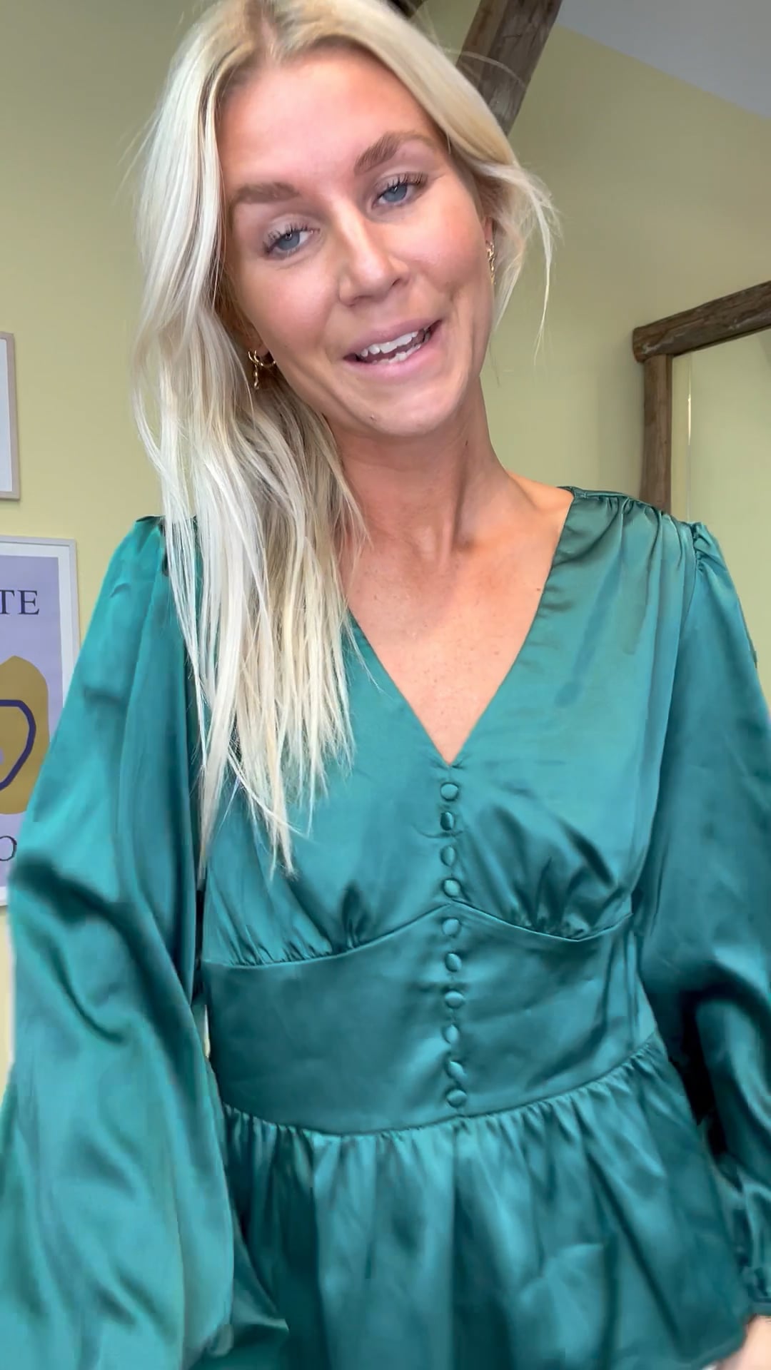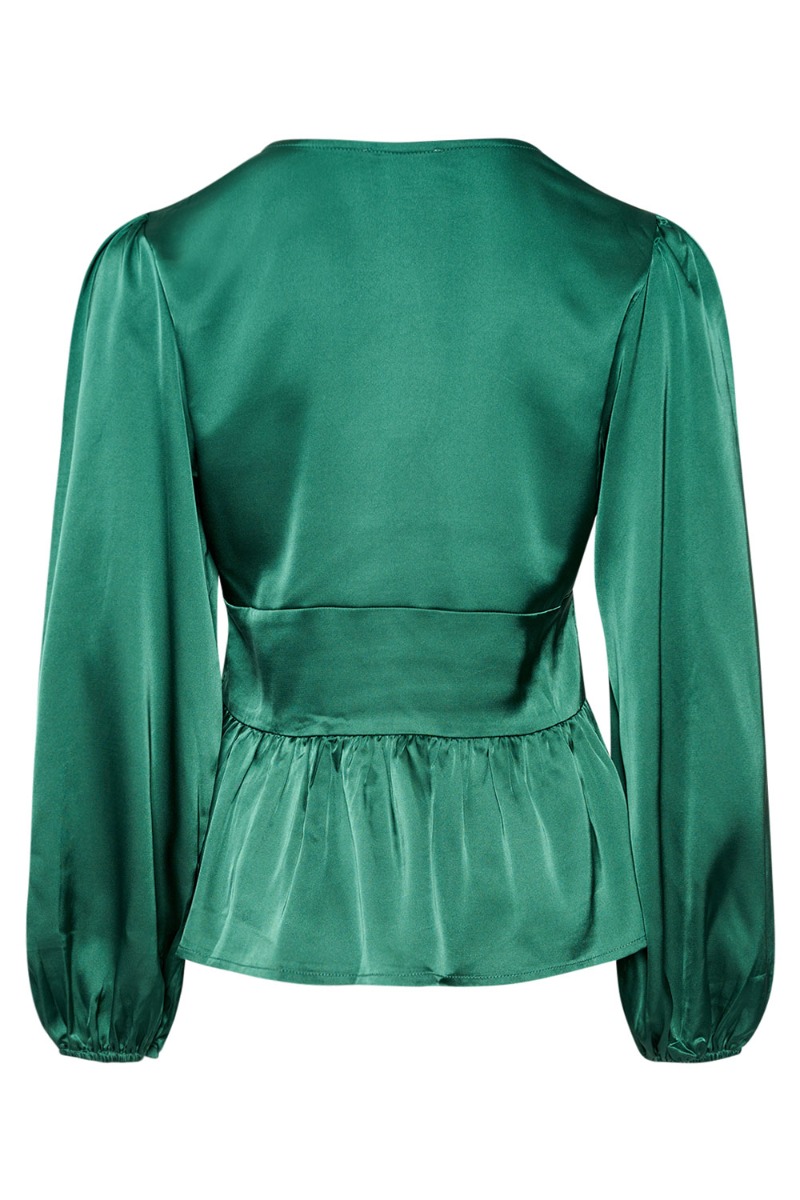 En smuk flaskegrøn farve til denne bluse er helt klart det der gør den perfekt til efteråret. Blusen er med peplum og en snyde stofbetrukket knapper foran. Blusen har skjult lynlås i siden så den kan komme af og på. Style den både til fint brug eller mere afslappet med jeans.