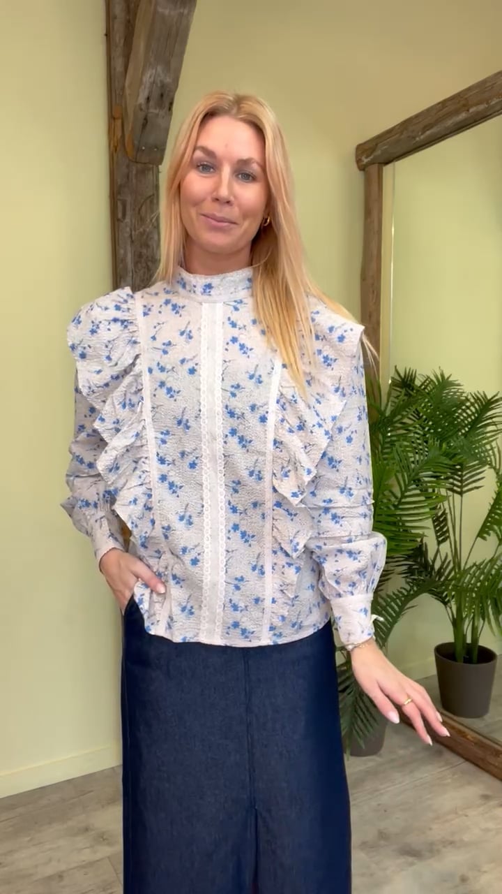 Den fineste bluse fra Noella! Blusen har flæsedetaljer og er med høj hals. Den er løs i pasformen og har det fineste blå blomsterprint. Printes findes også i en kjole og er super smukt til den kommende sæson. Style blusen til et par jeans for et hverdagslook eller dress den op med en fin nederdel til festlig brug.